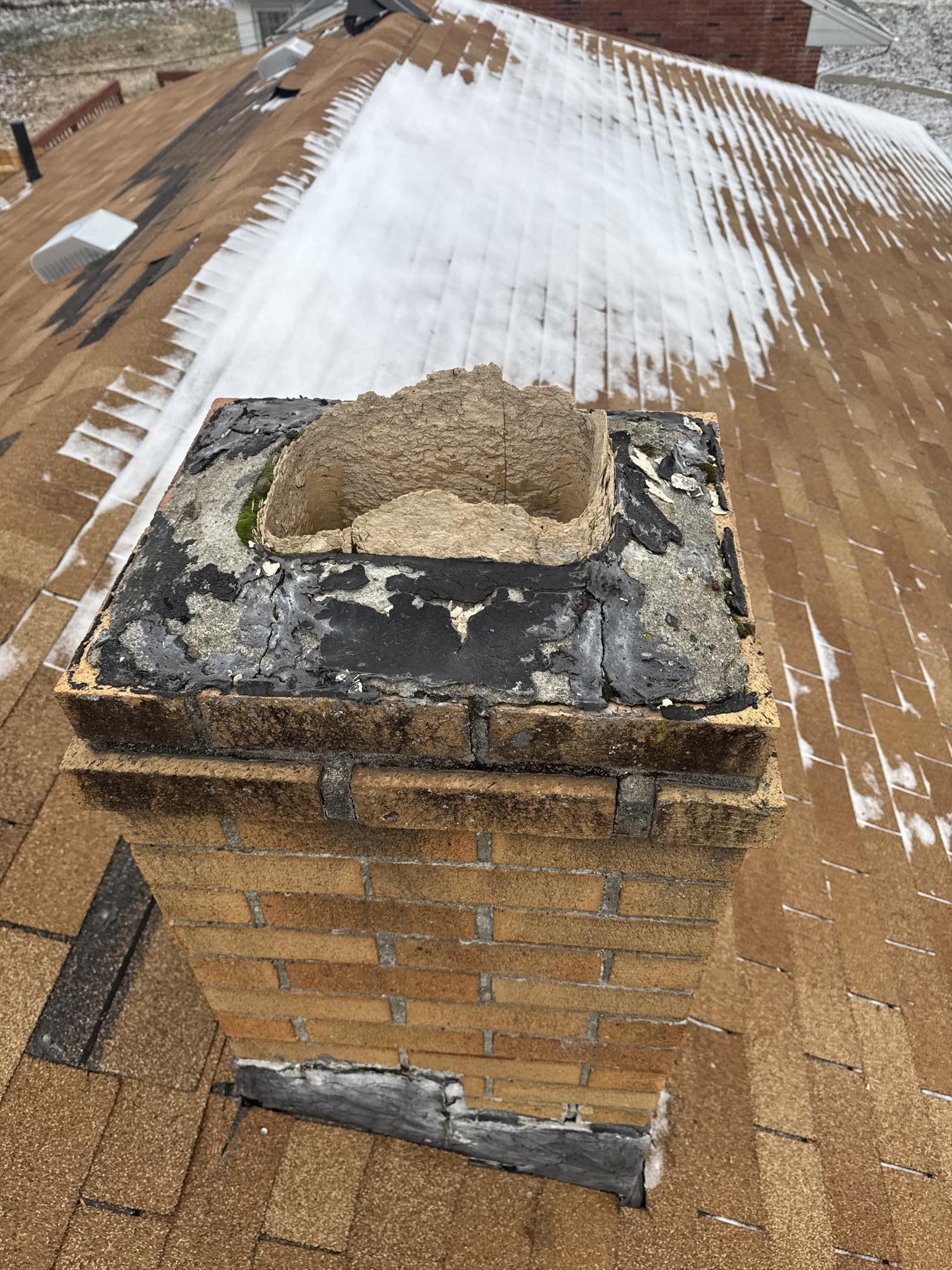Close-up of a brick chimney showing significant damage to the flashing, peeling sealant, and a deteriorated crown, indicative of wind and weather wear on a shingled roof.