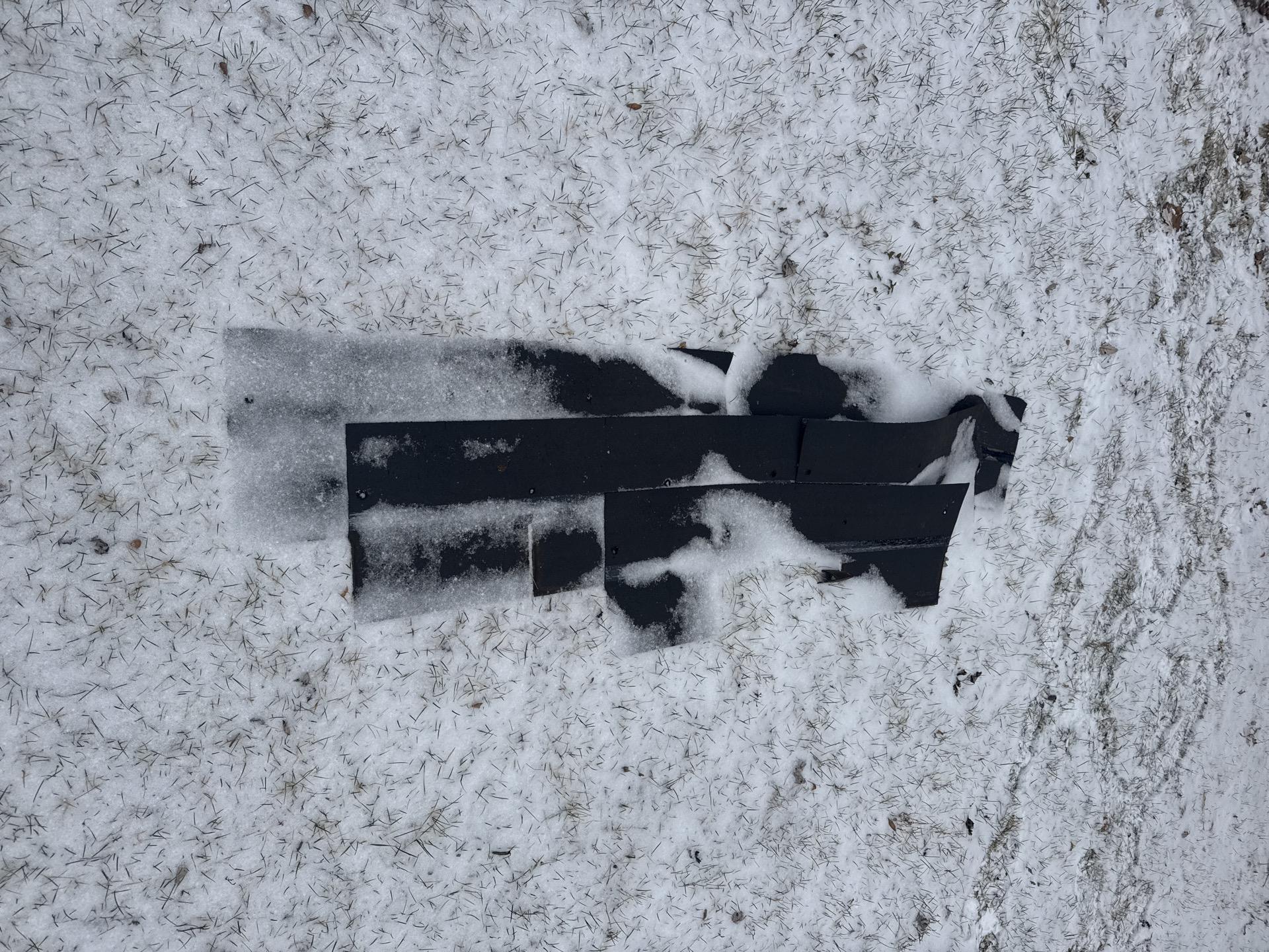 Black asphalt shingles, debris from severe wind damage, scattered on snow-covered grass.