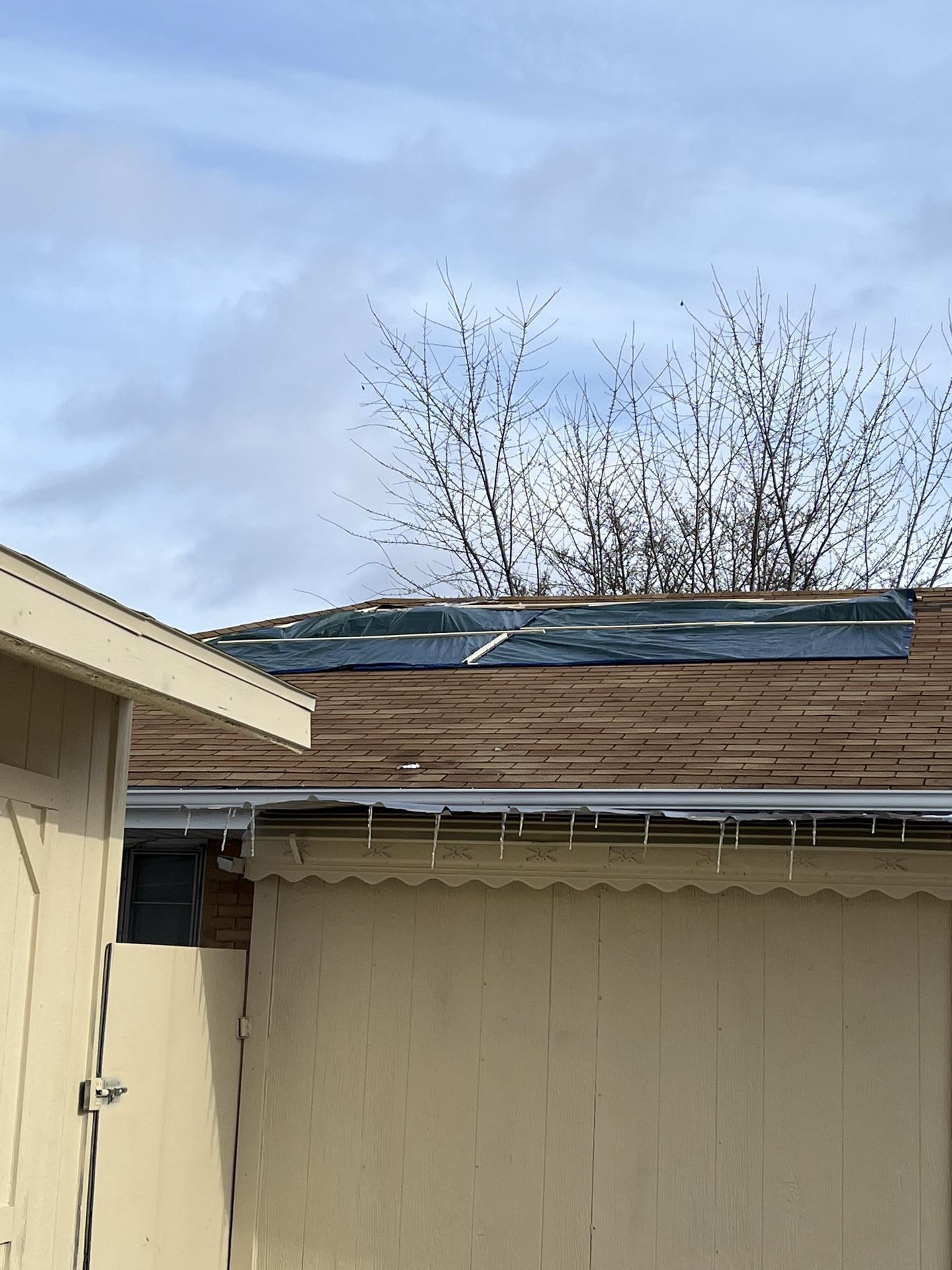 Comprehensive exterior shot of a home displaying a large blue tarp covering a significant portion of the roof, indicating emergency restoration work for wind damage.