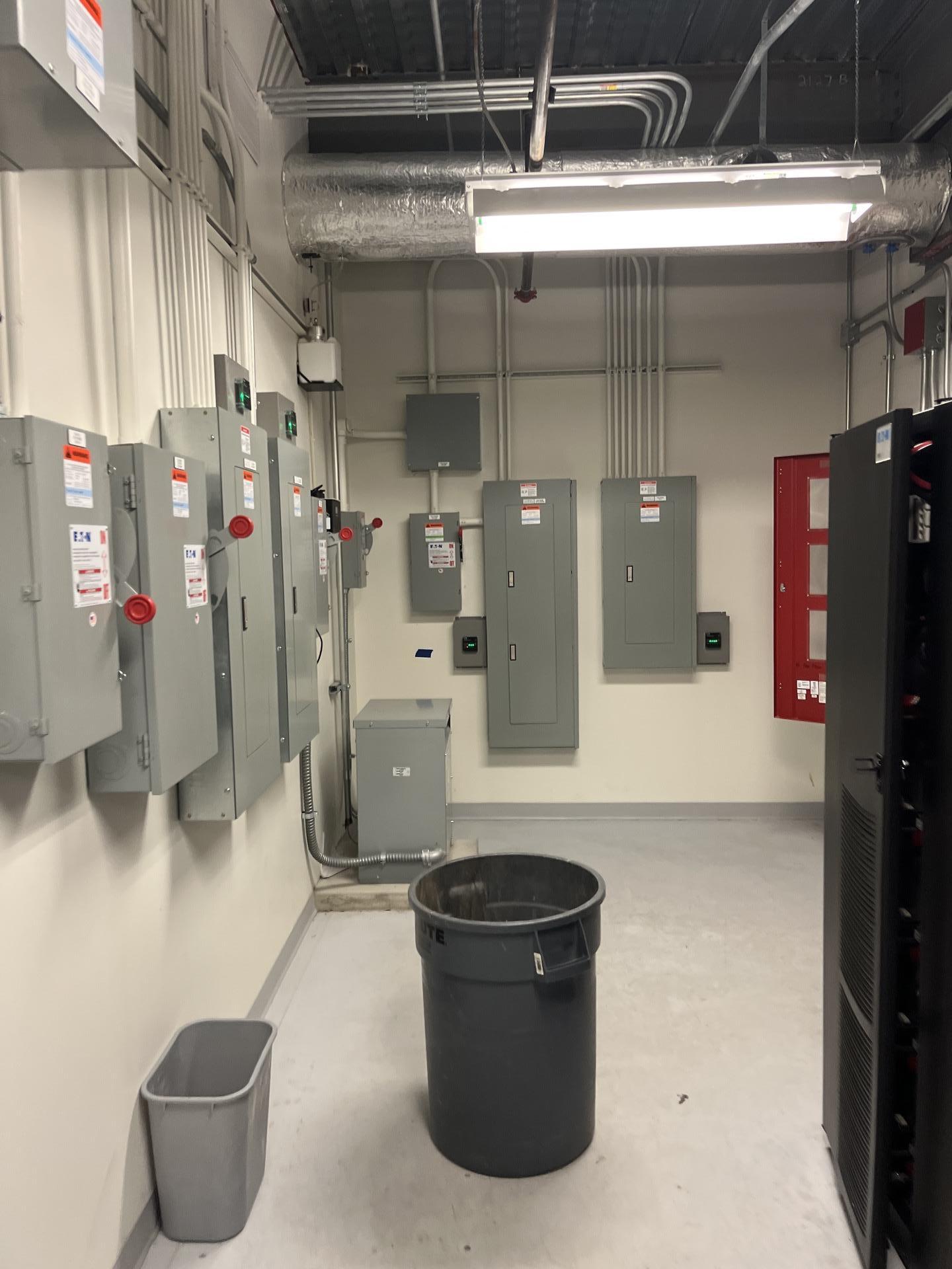 An organized electrical support room in the basement with various circuit breaker panels, restored after water damage.