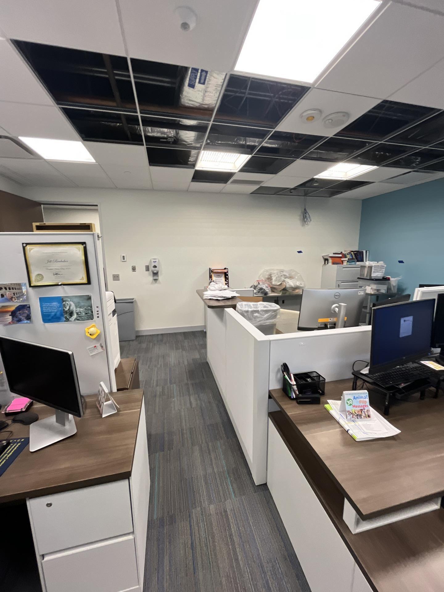A staff development office in the basement with sections of ceiling tiles removed, indicating an ongoing or completed water damage repair and restoration project.