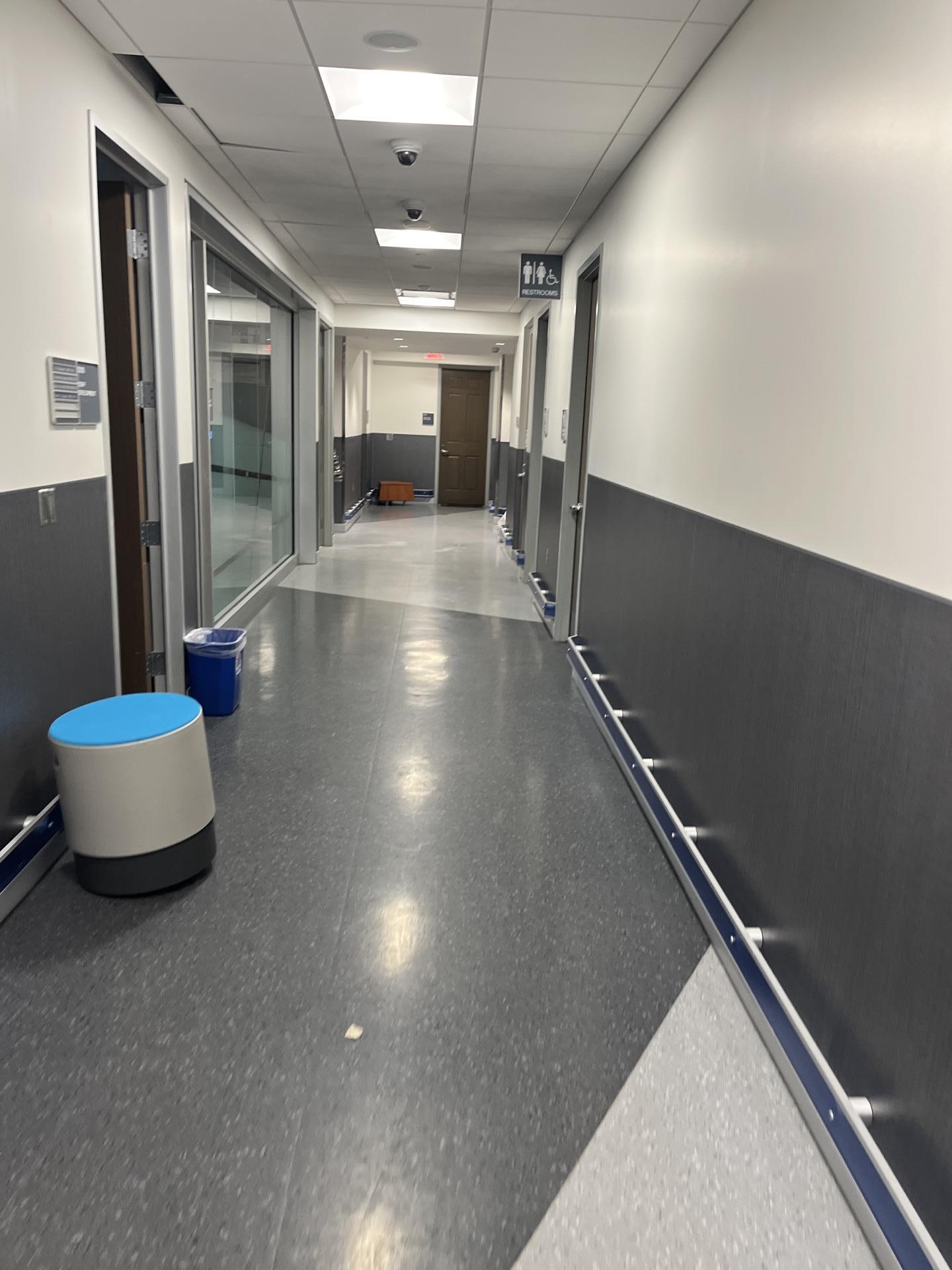 A long, clean main hallway in the basement, showing the results of water damage restoration efforts.