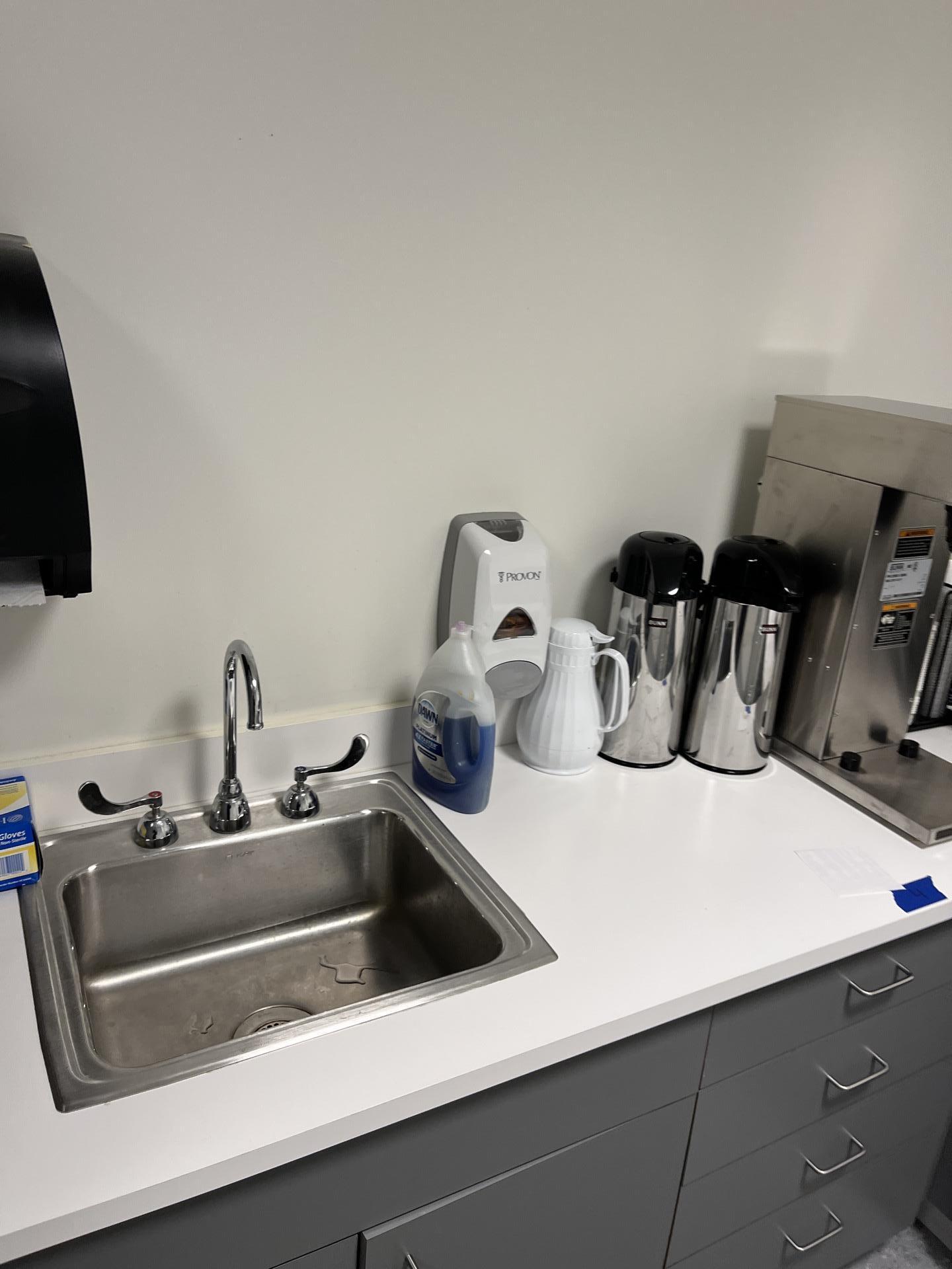 A clean kitchenette area with a sink and coffee makers, part of the restored basement staff development area after water damage.