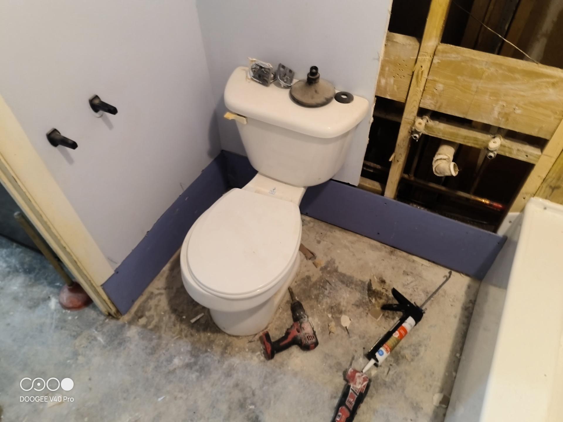 Bathroom under renovation with a new toilet being installed, showing exposed wall studs and blue waterproof backer board after water damage repair.