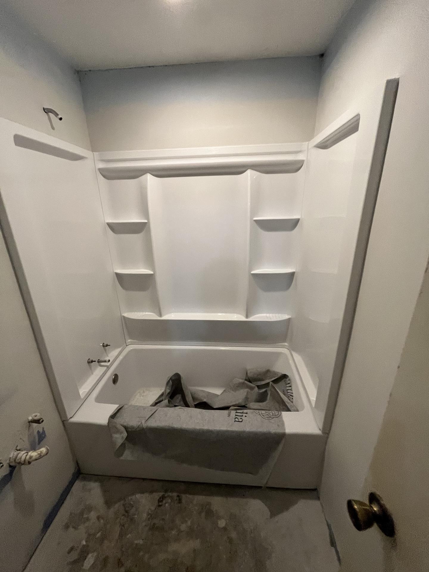 Newly installed white bathtub and shower surround in a renovated bathroom after complete water damage restoration.