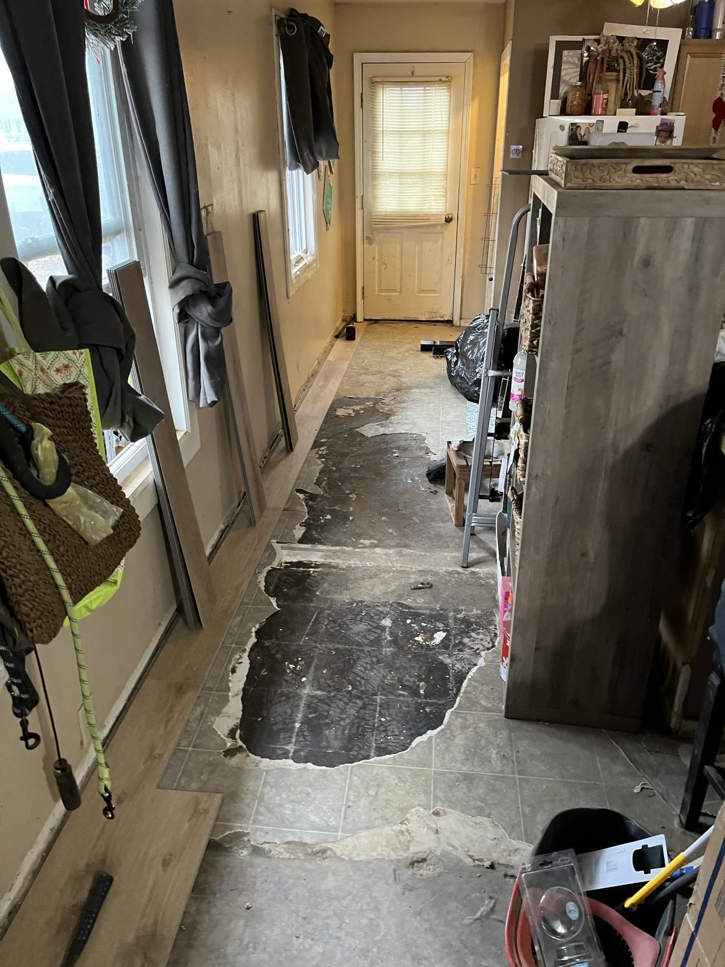 Extensive water damage to peeling and degraded flooring in a living room or hallway, requiring full floor replacement.