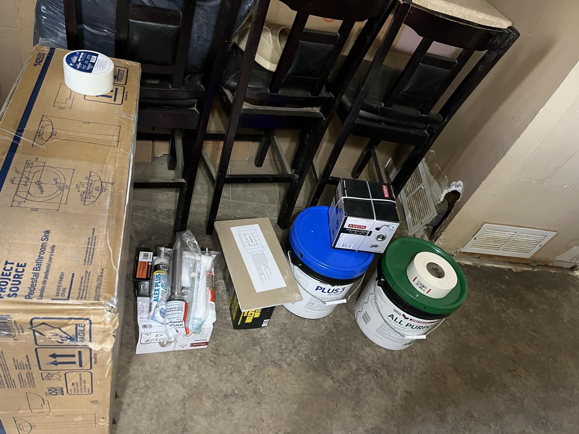 Construction materials and supplies, including taping mud, caulk, paint, and a new pedestal sink box, for water damage restoration in a residential home.