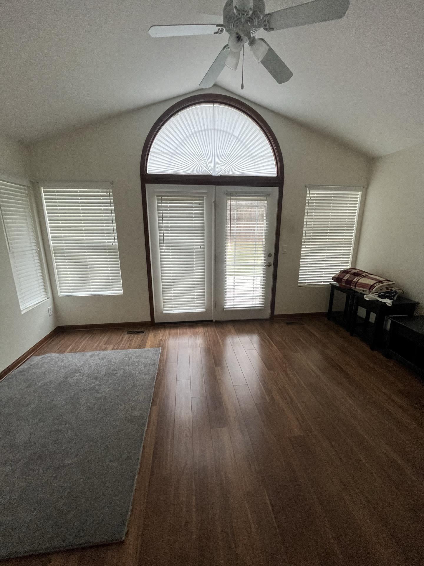Den or sunroom area with large arched window and hardwood floors, fully remediated from smoke damage.