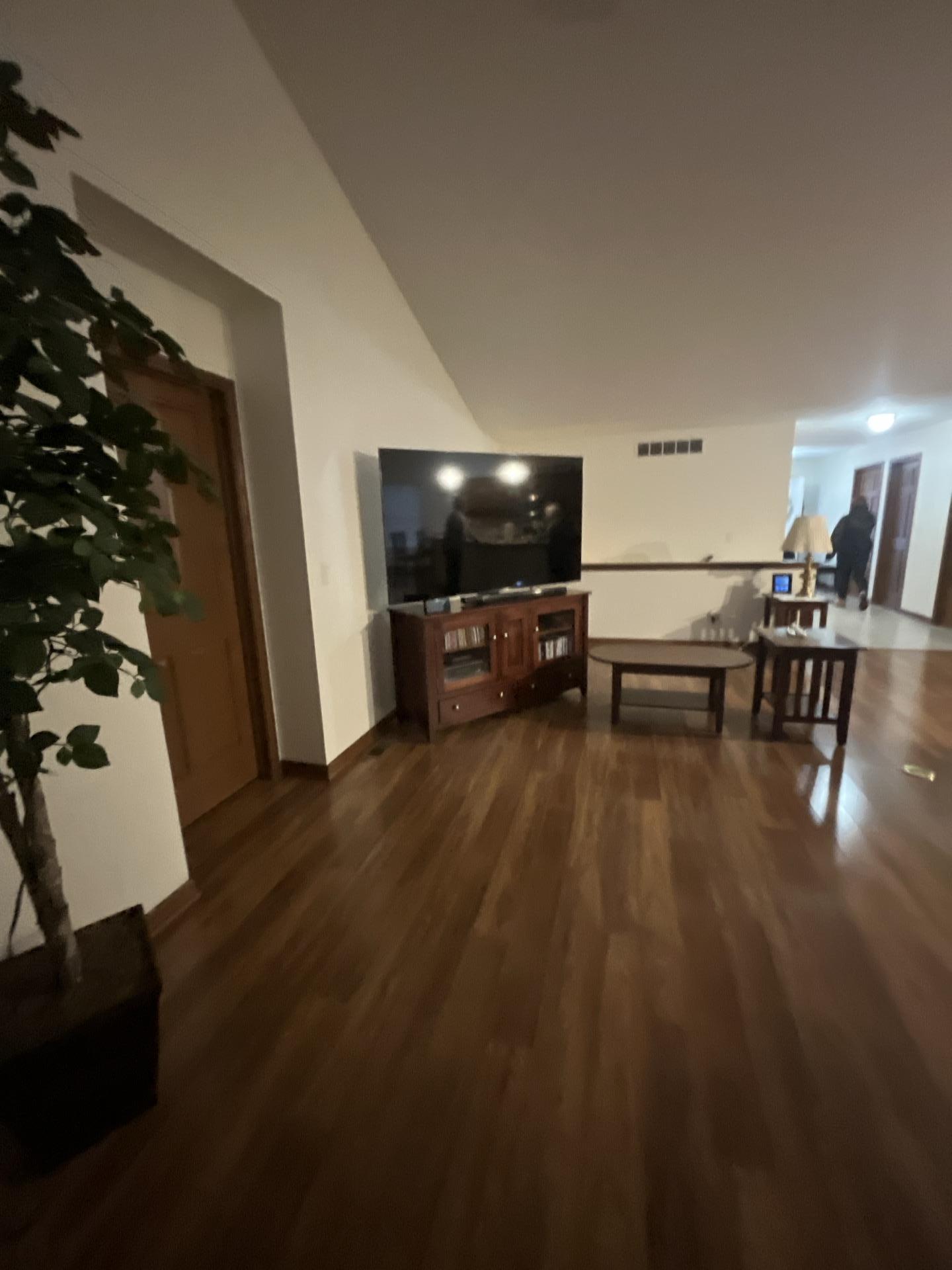 Smoke-damaged living room or den with hardwood floors and entertainment system, now clean.