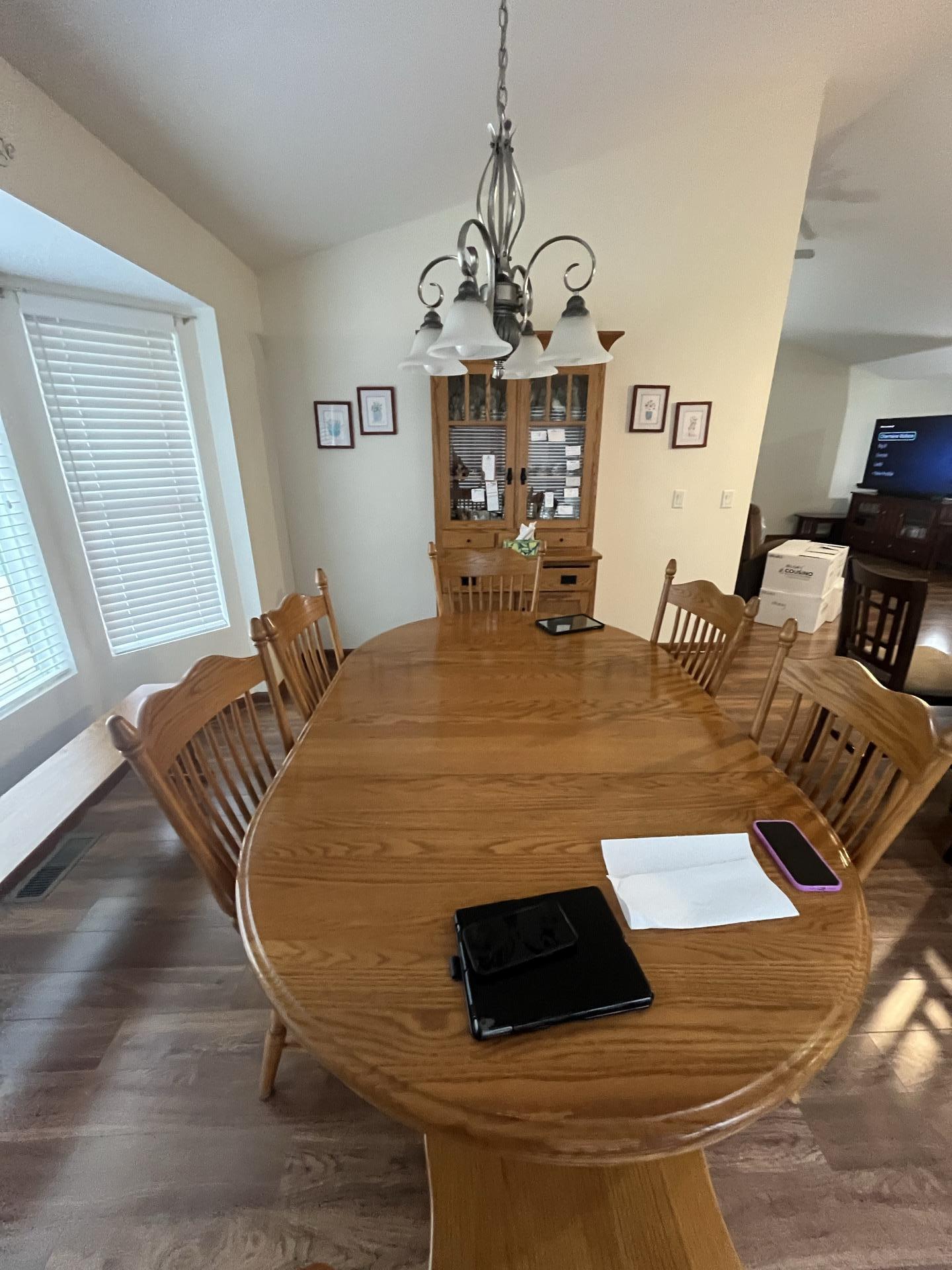 Dining room with a wooden table and chairs on hardwood floors, indicating successful smoke damage cleaning.