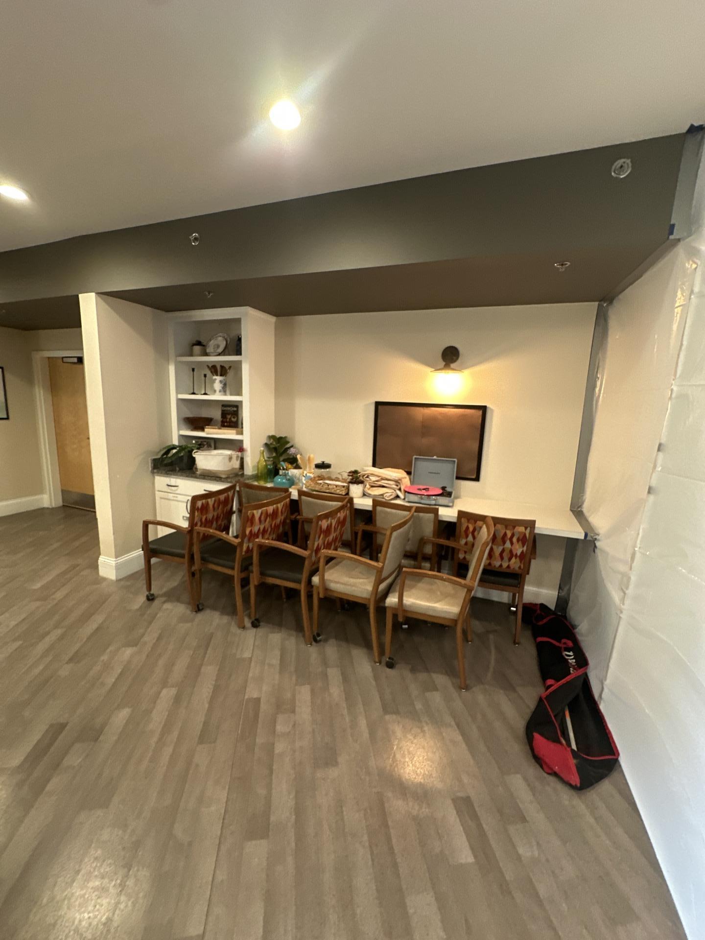 Cousino Restoration performed moisture readings to assess the extent of the damage, moved contents to protect belongings and facilitate work, set up containment barriers, installed an air scrubber to achieve negative air pressure, removed baseboards, pulled down drywall, sprayed and wiped down all exposed studs for cleaning and decontamination, and mopped the dining room area as part of the cleanup process.