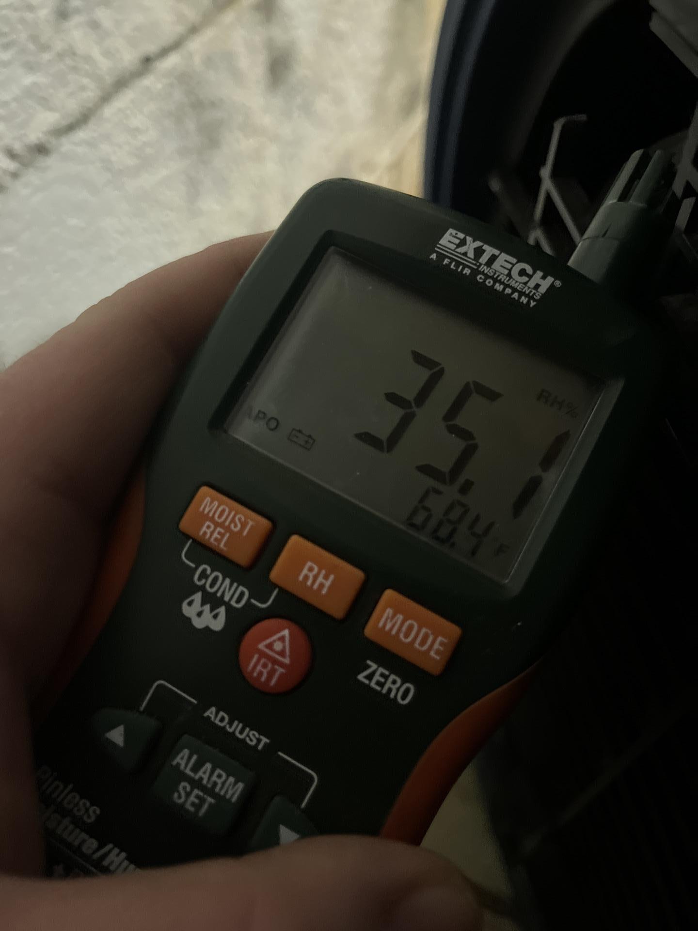 A professional Extech moisture meter displays a relative humidity reading of 35.1% and a temperature of 68.4°F during a property restoration assessment. This precise monitoring is essential for humidity control and structural drying to ensure a healthy indoor environment.