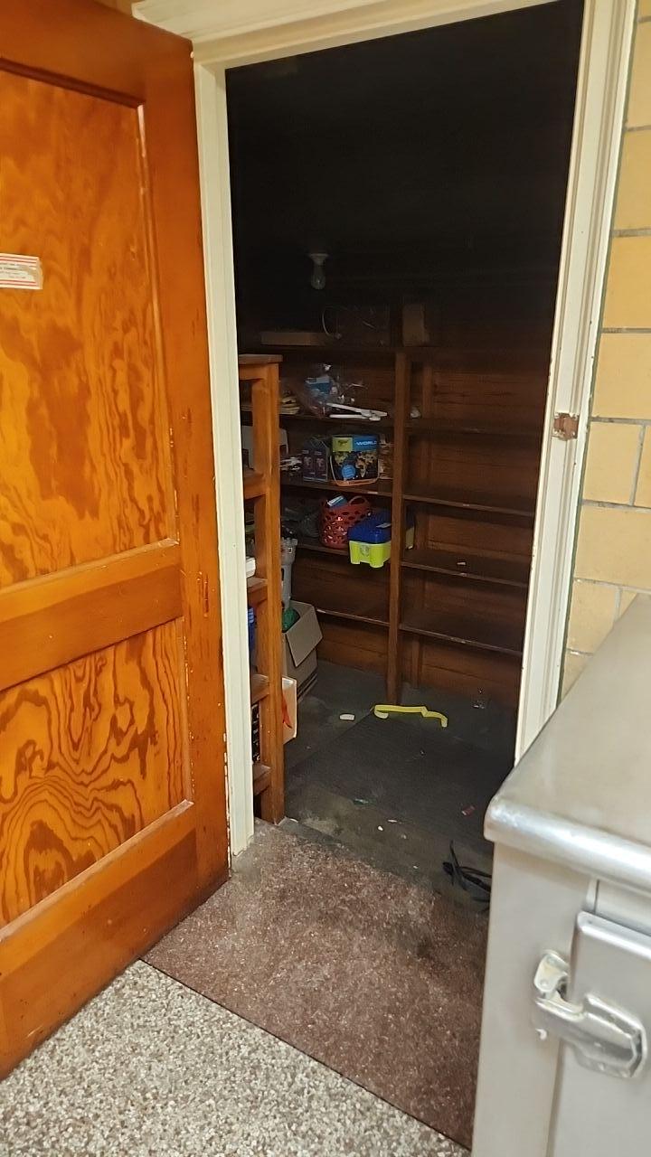 An open doorway leading to a storage room with shelves and a dark, potentially water-damaged floor, awaiting assessment.