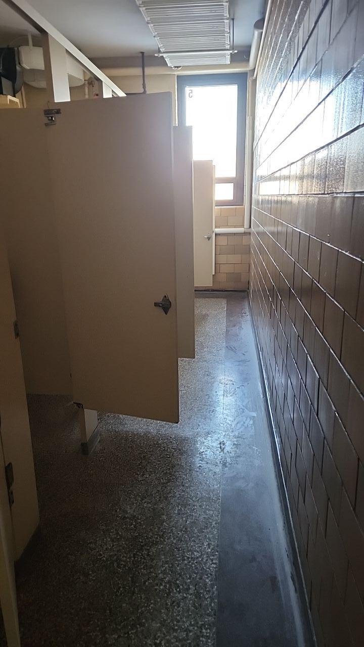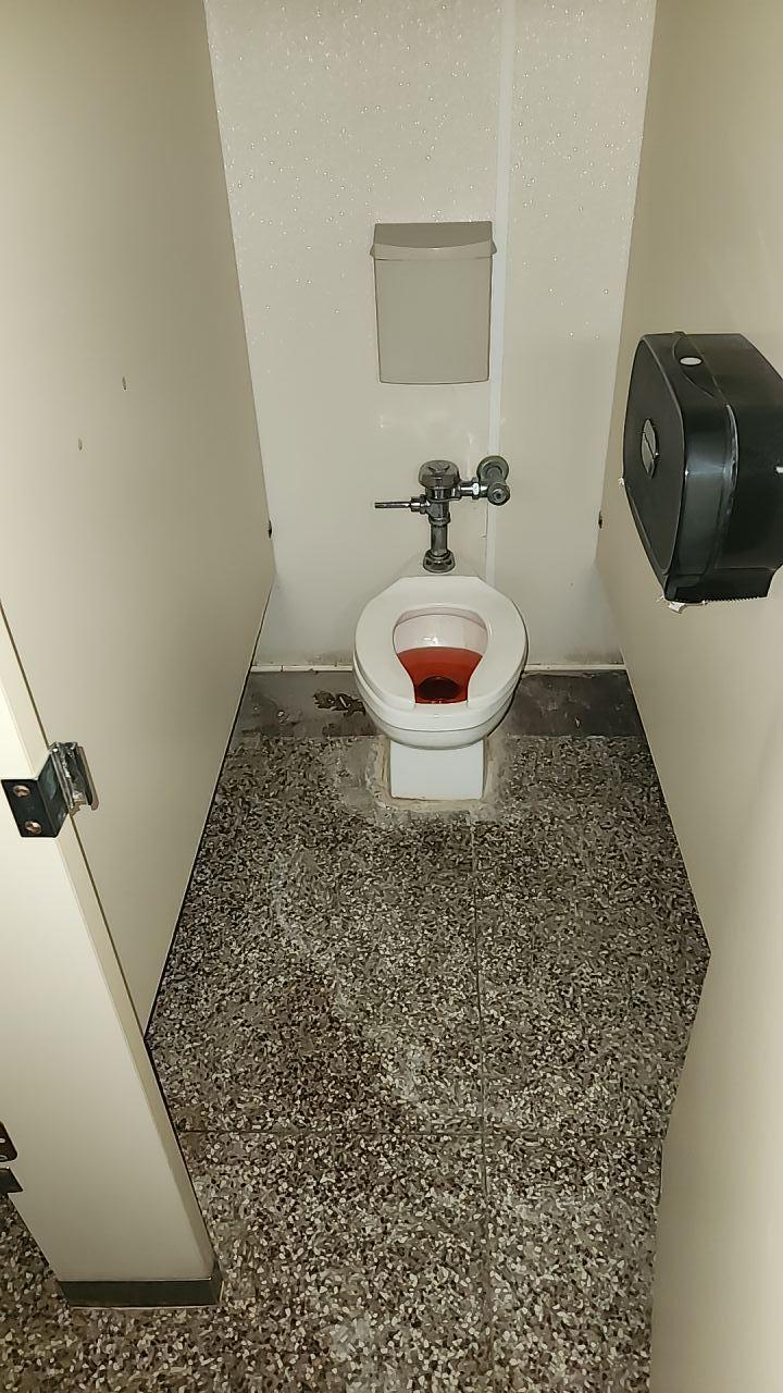 A toilet stall with a visibly wet floor, indicating water damage in a commercial restroom.