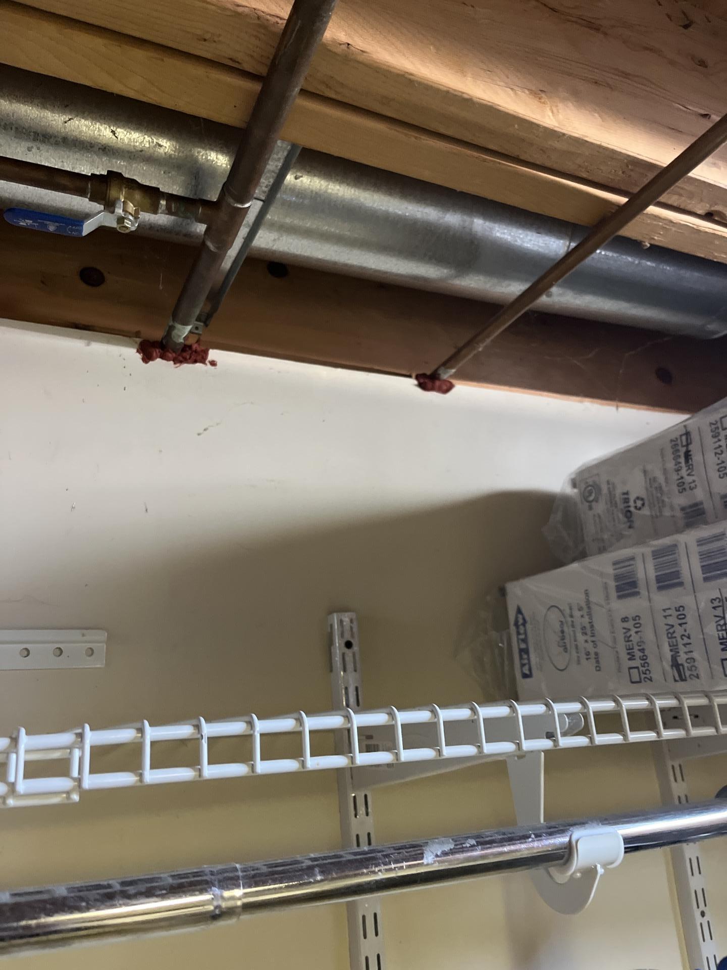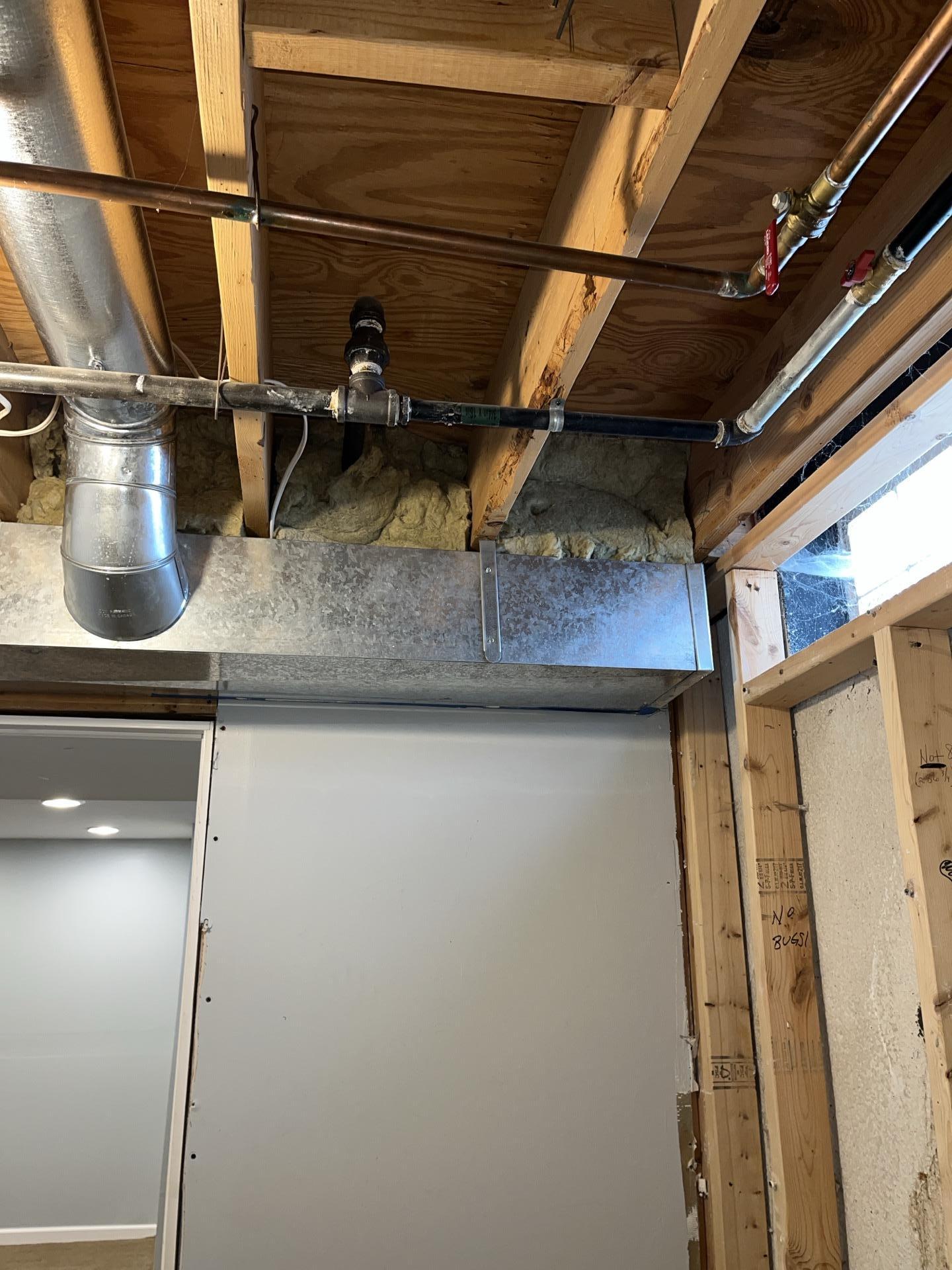 Basement ceiling showing repaired plumbing pipes, ductwork, and insulation after remediation