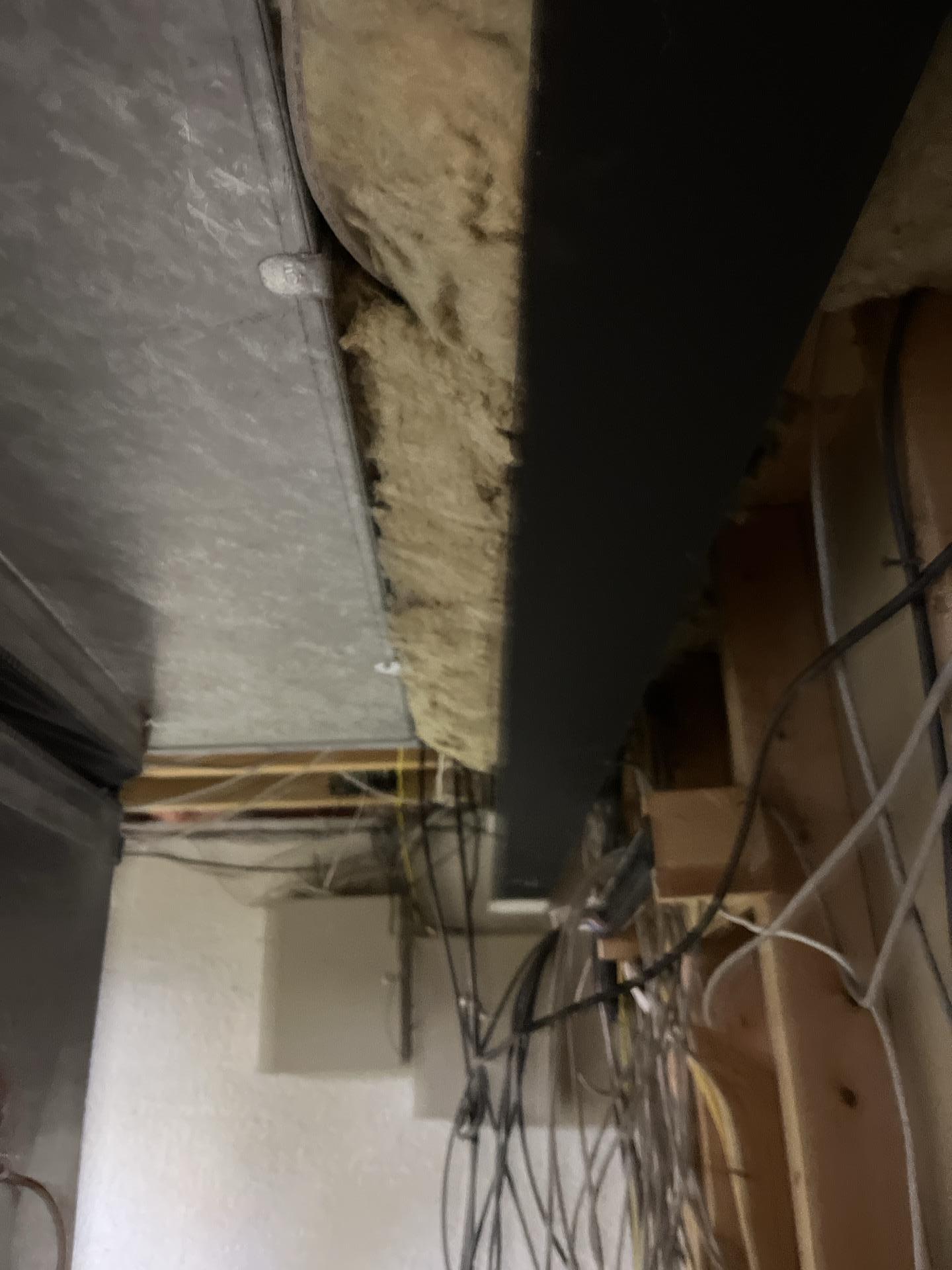 Overview of basement ceiling showing large duct, insulation, and organized wiring during final repair