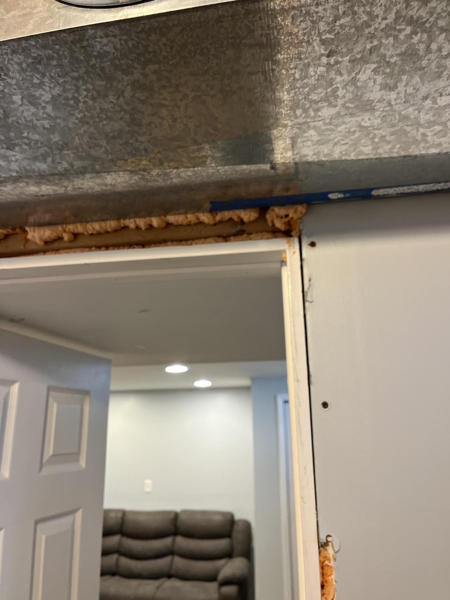 Close-up of spray foam insulation sealing around basement ductwork and doorframe for air sealing