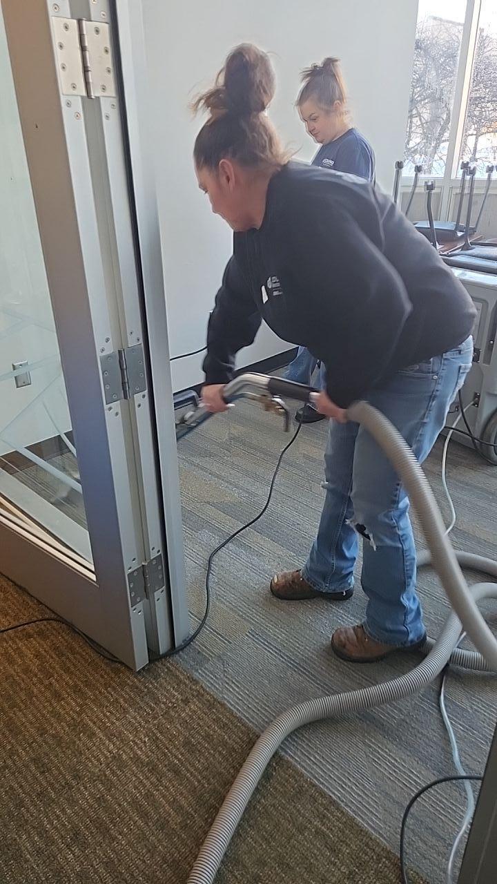 Cousino Restoration technician performing water extraction on a commercial carpet using specialized equipment to address water damage.