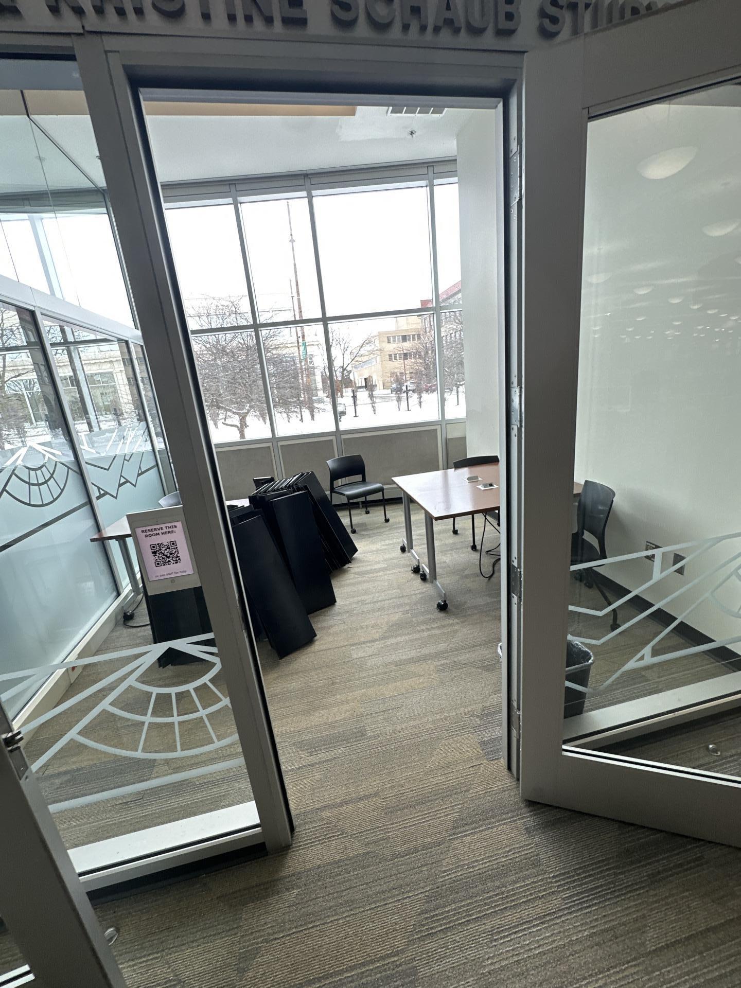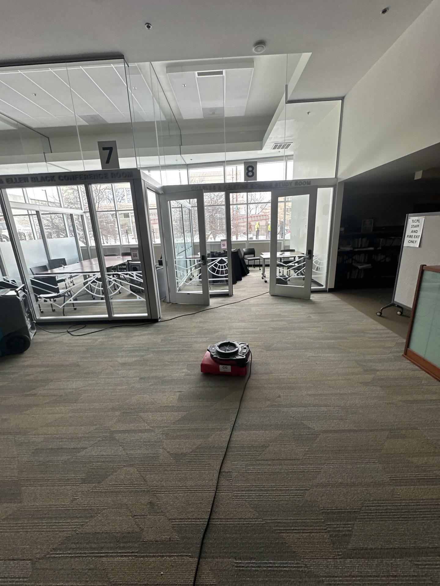 View into a modern glass-walled commercial office or study room with carpeted floors, part of the areas addressed during water damage restoration