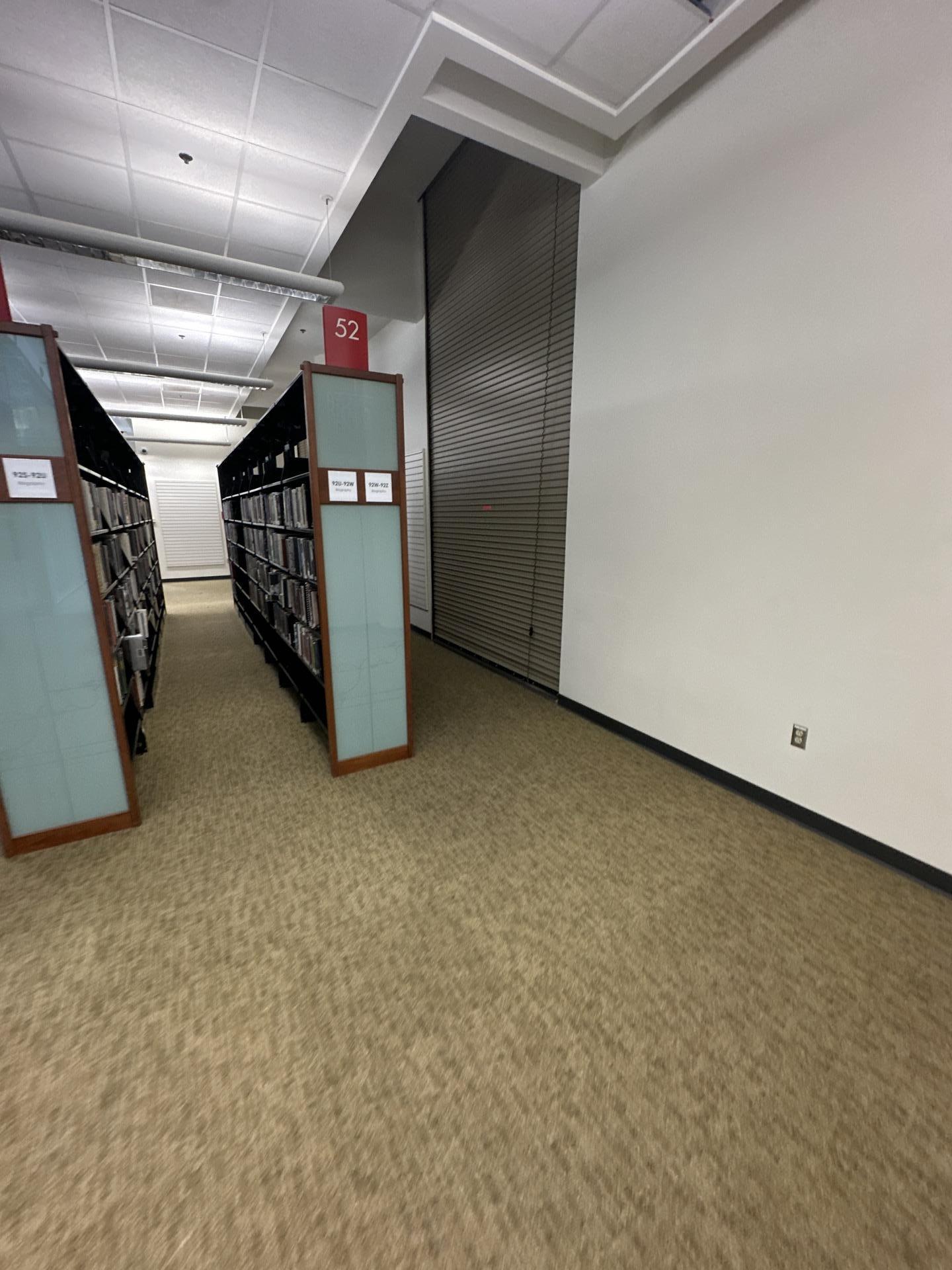 A carpeted hallway with bookshelves in a commercial or institutional building, showing the general area of water damage restoration work.