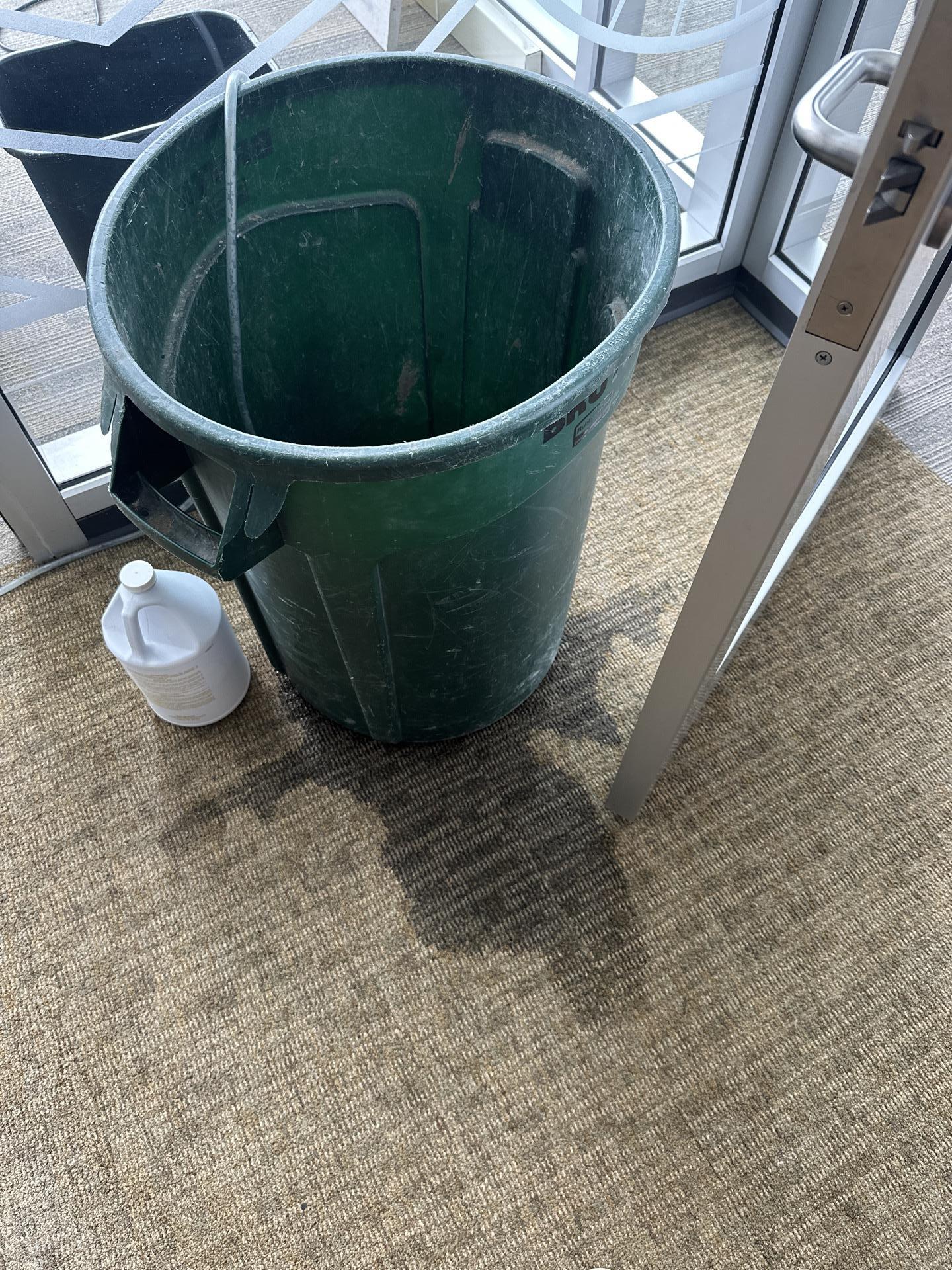 Close-up view of a noticeable water stain on commercial carpet next to a utility bin, indicating an area affected by water damage.