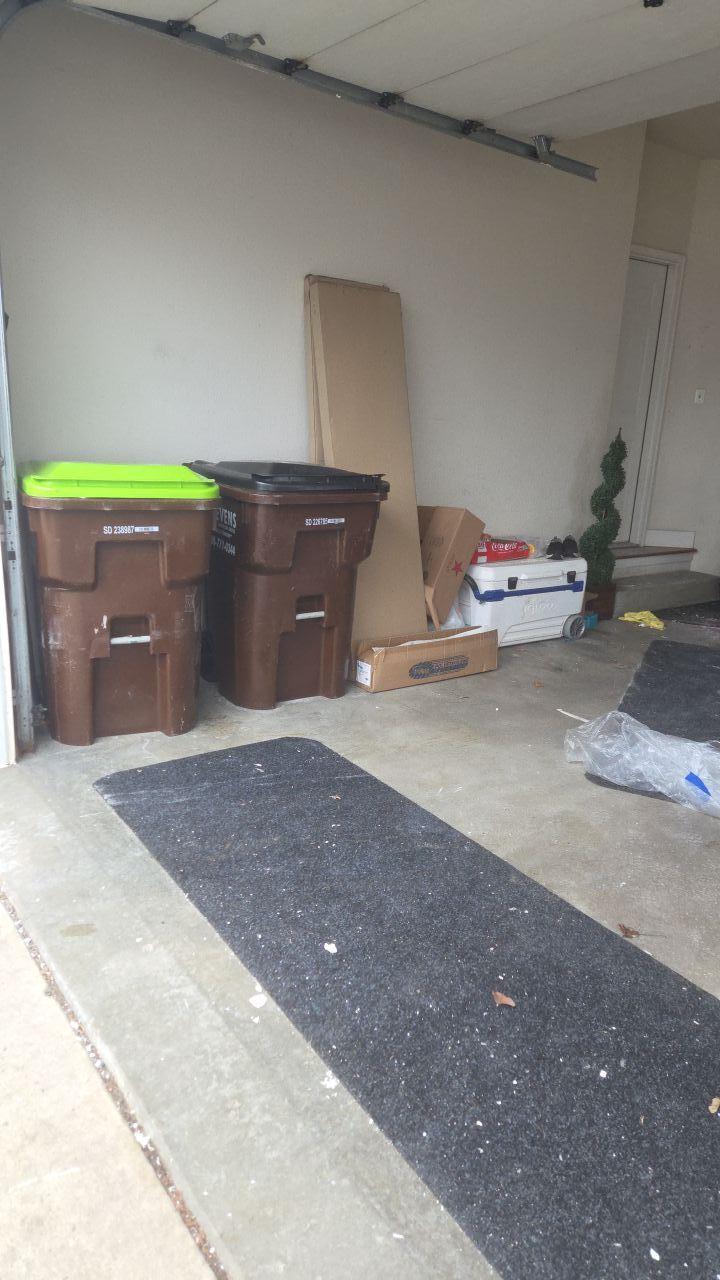Two large brown trash bins in a garage, filled with debris from water damage demolition and cleanup.