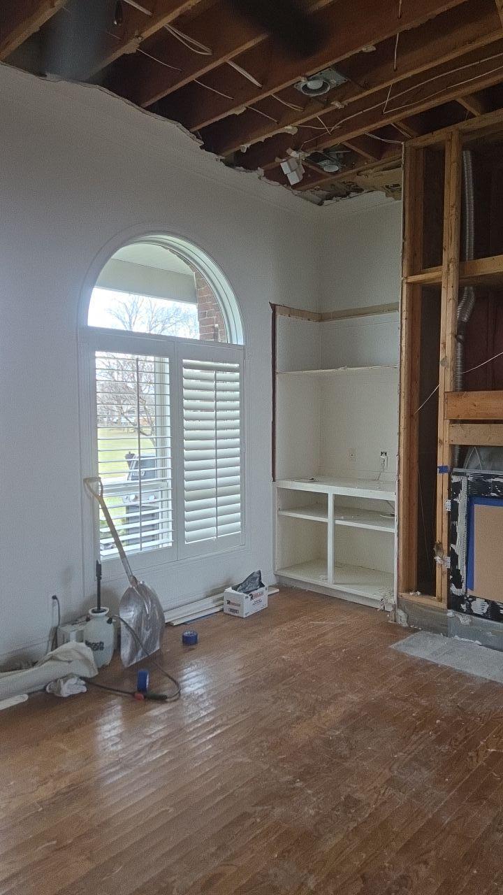 Interior view of a room with ceiling and flooring removed, exposing joists and wall framing as part of extensive water damage restoration.