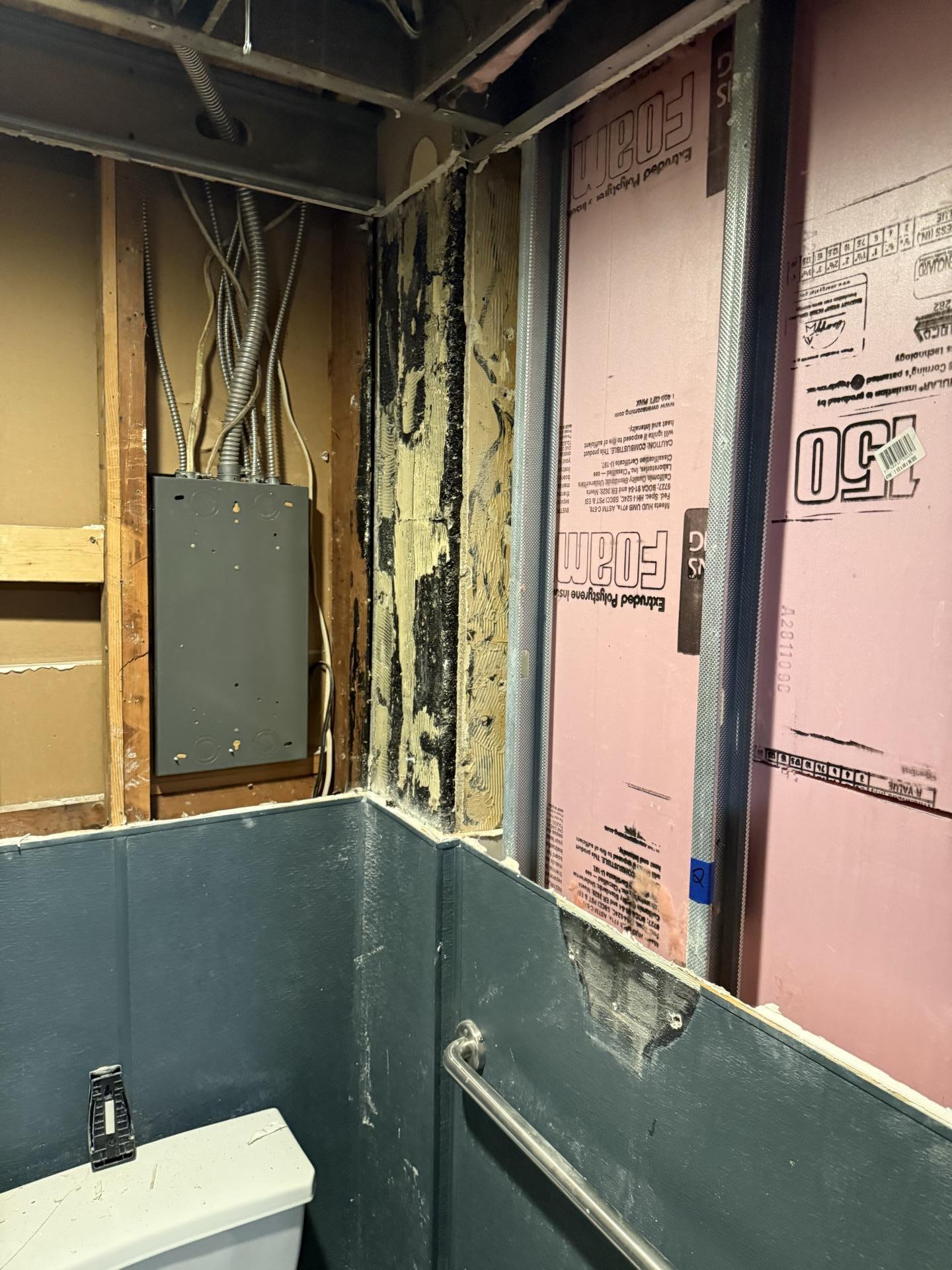 Cousino Restoration technicians remediating water damaged wall and electrical area in a commercial basement, showing exposed studs and insulation during restoration.