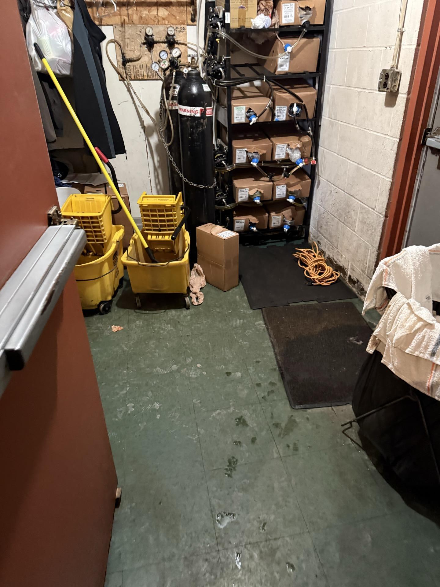 Commercial utility room floor showing standing water, cleaning supplies, and equipment, indicating ongoing water damage cleanup by Cousino Restoration.