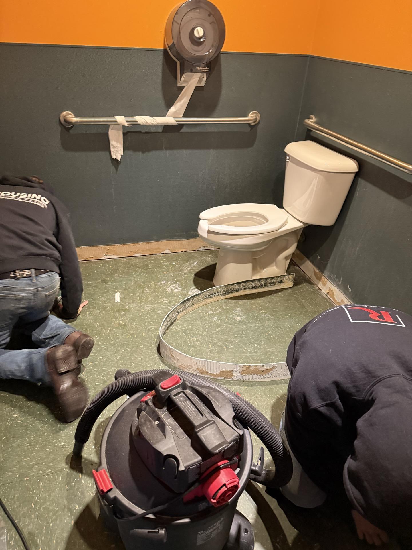 Cousino Restoration technicians using a shop vac to clean up water and debris in a public restroom with a toilet and removed floor trim, part of water damage repair.