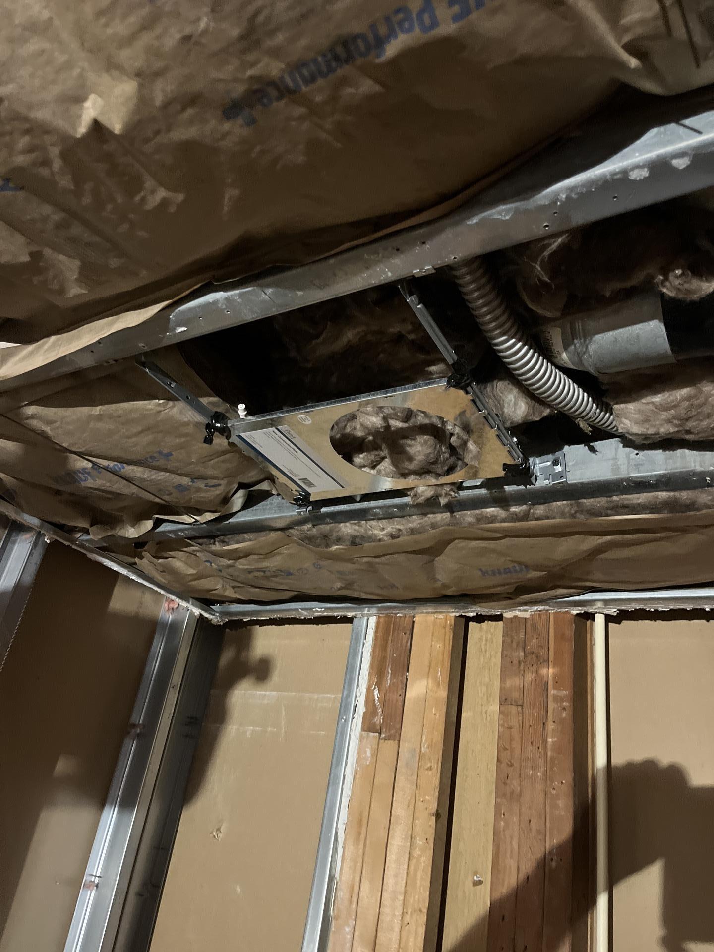 Exposed ceiling insulation and framing showing an access point during water damage repair in a commercial property, revealing structural work by Cousino Restoration.
