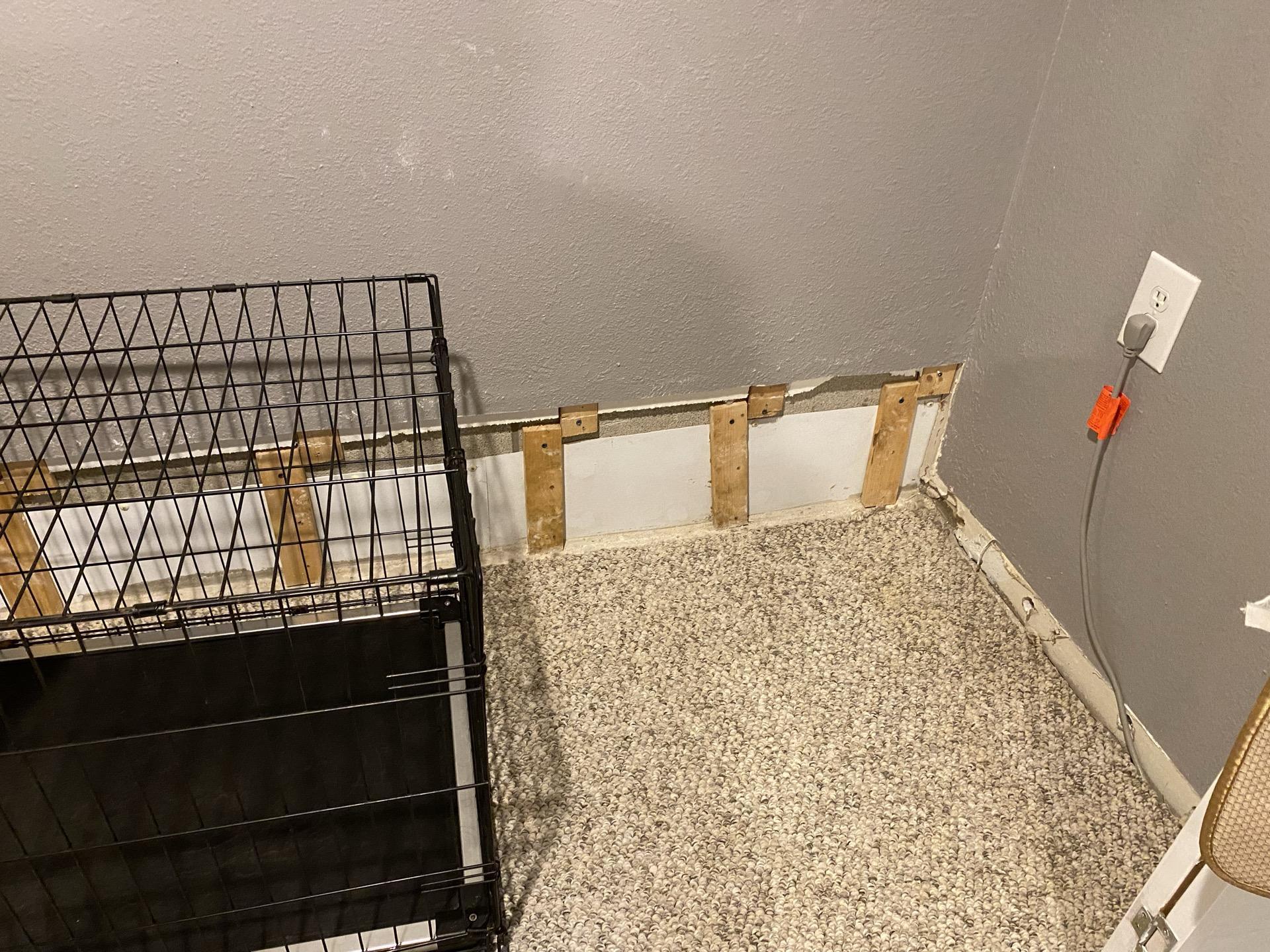 View of a wall with water-damaged drywall cut out at the base, exposing insulation and studs, during the remediation process with a pet crate visible.