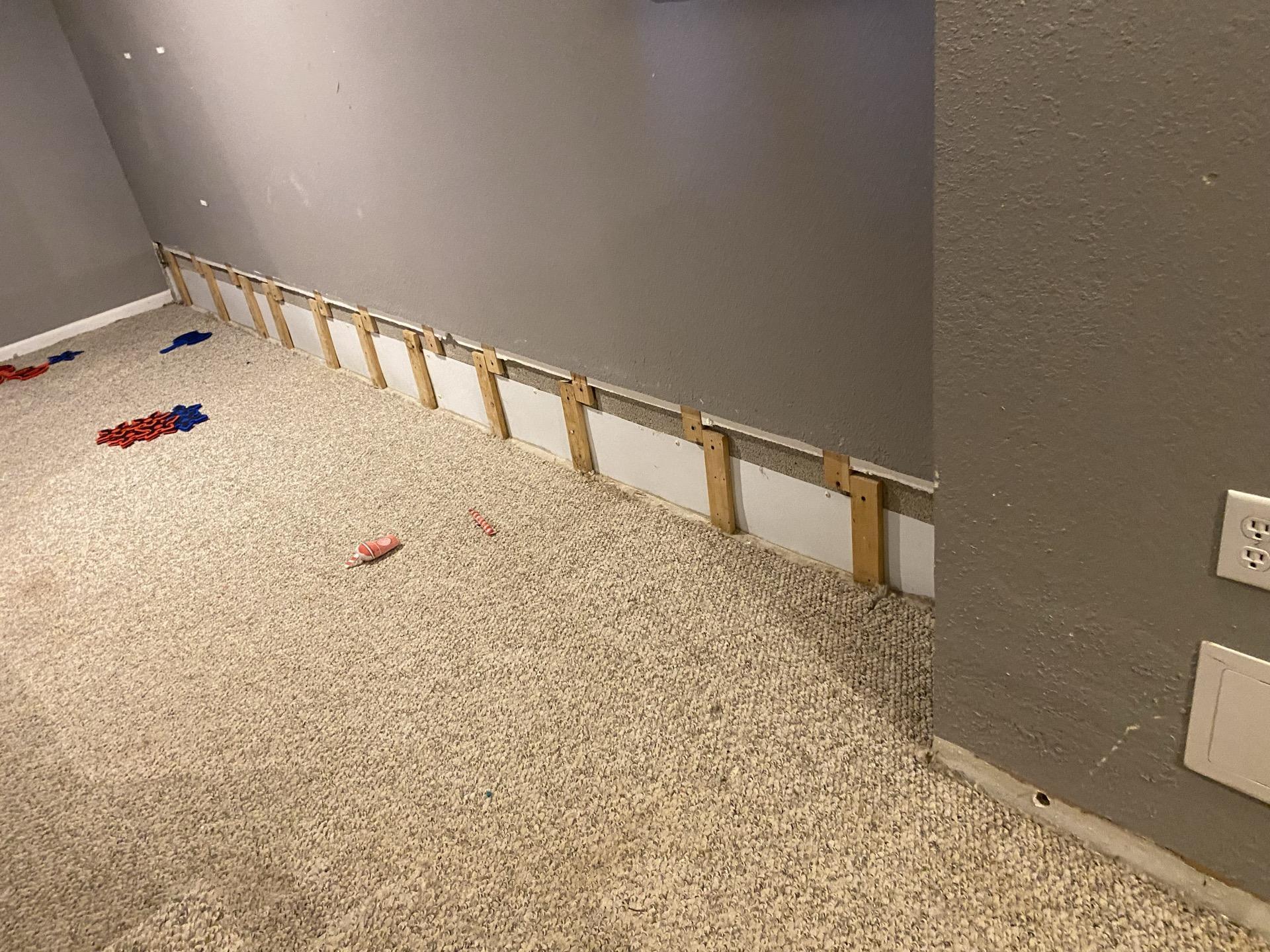 Overview of a room undergoing water damage mitigation, featuring the lower sections of drywall removed along the wall, revealing exposed studs above the carpeted floor.