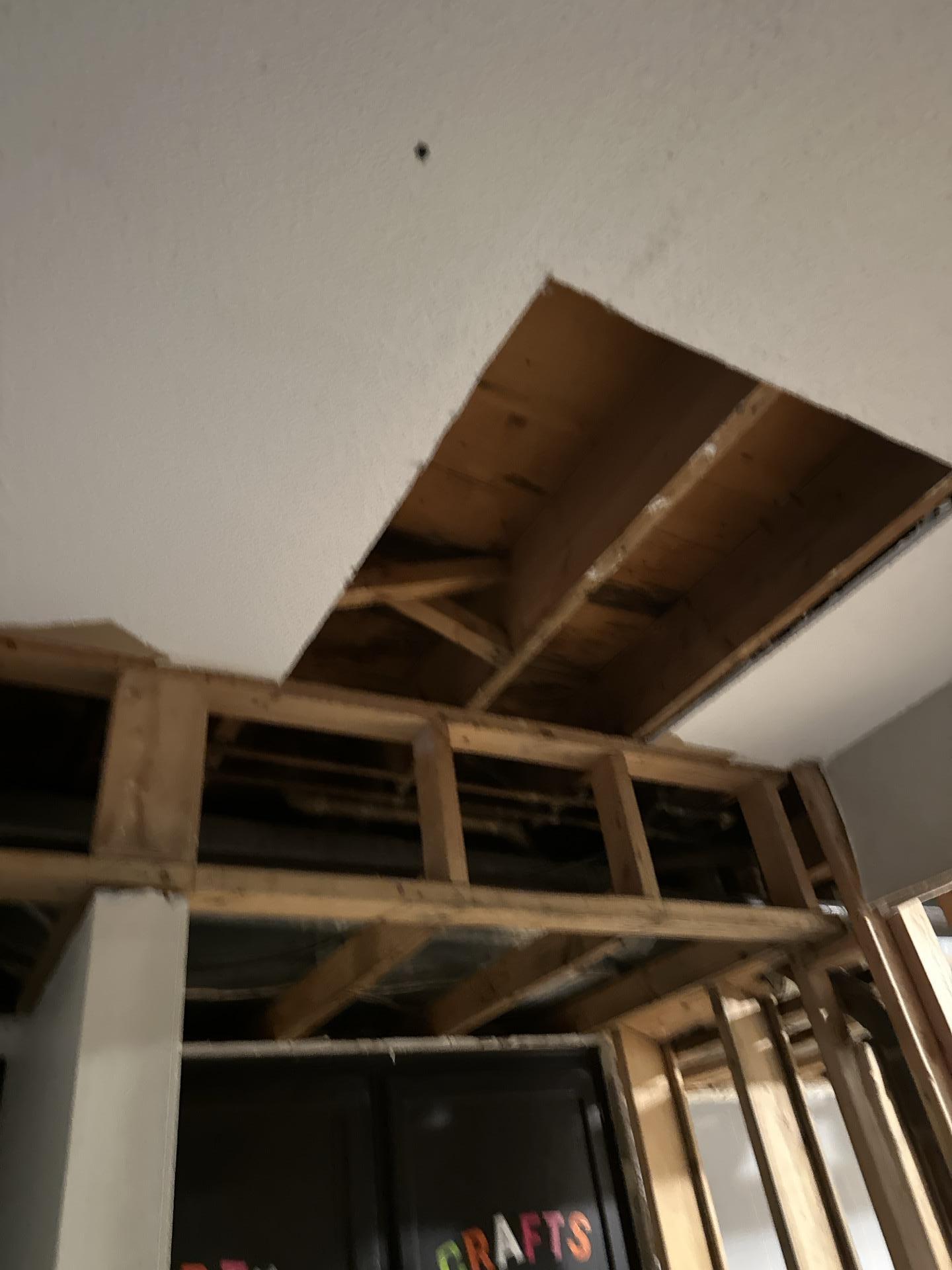 Detailed view of exposed ceiling structure, showcasing wooden joists, utility lines, and the aftermath of water damage remediation.