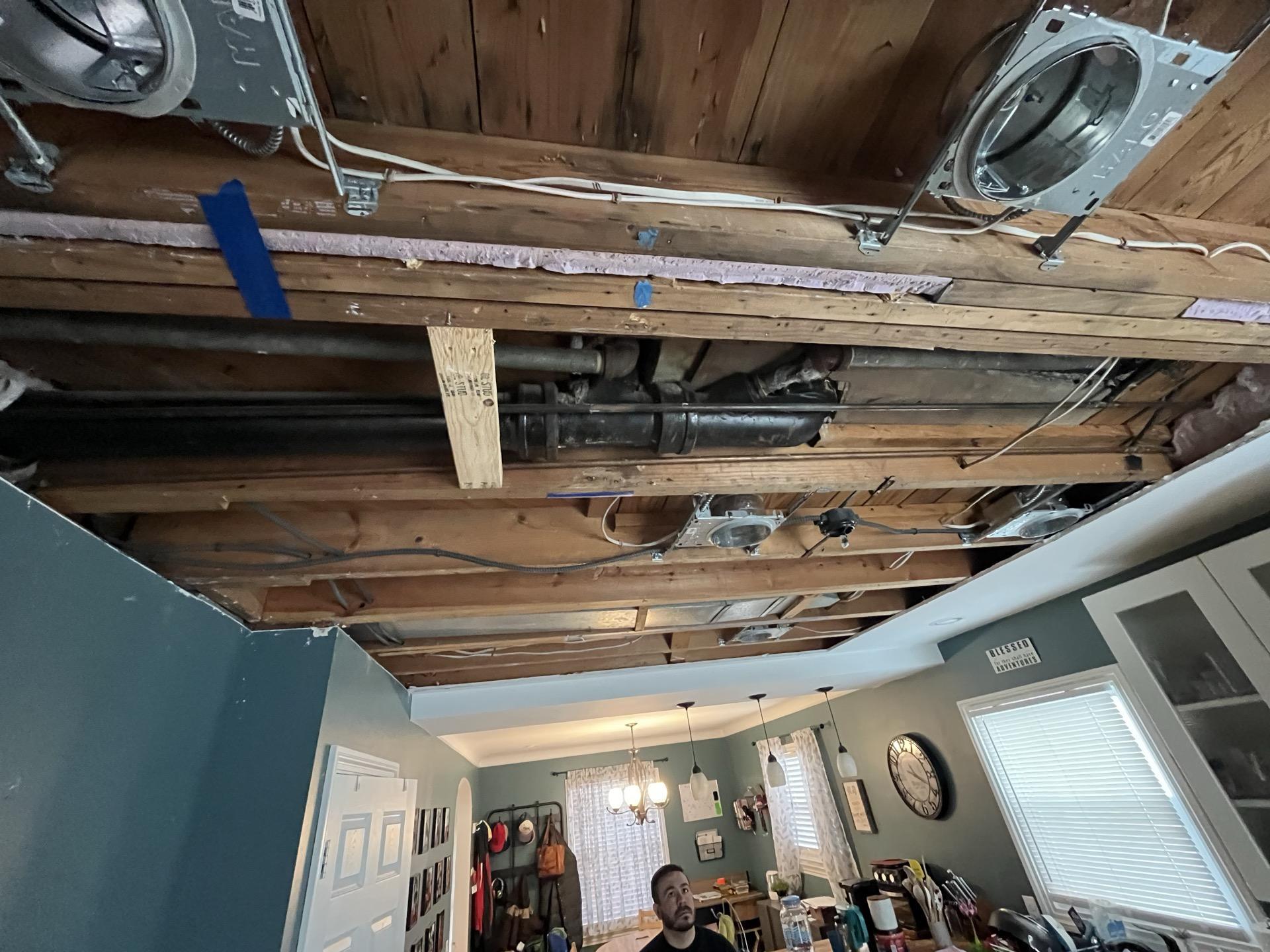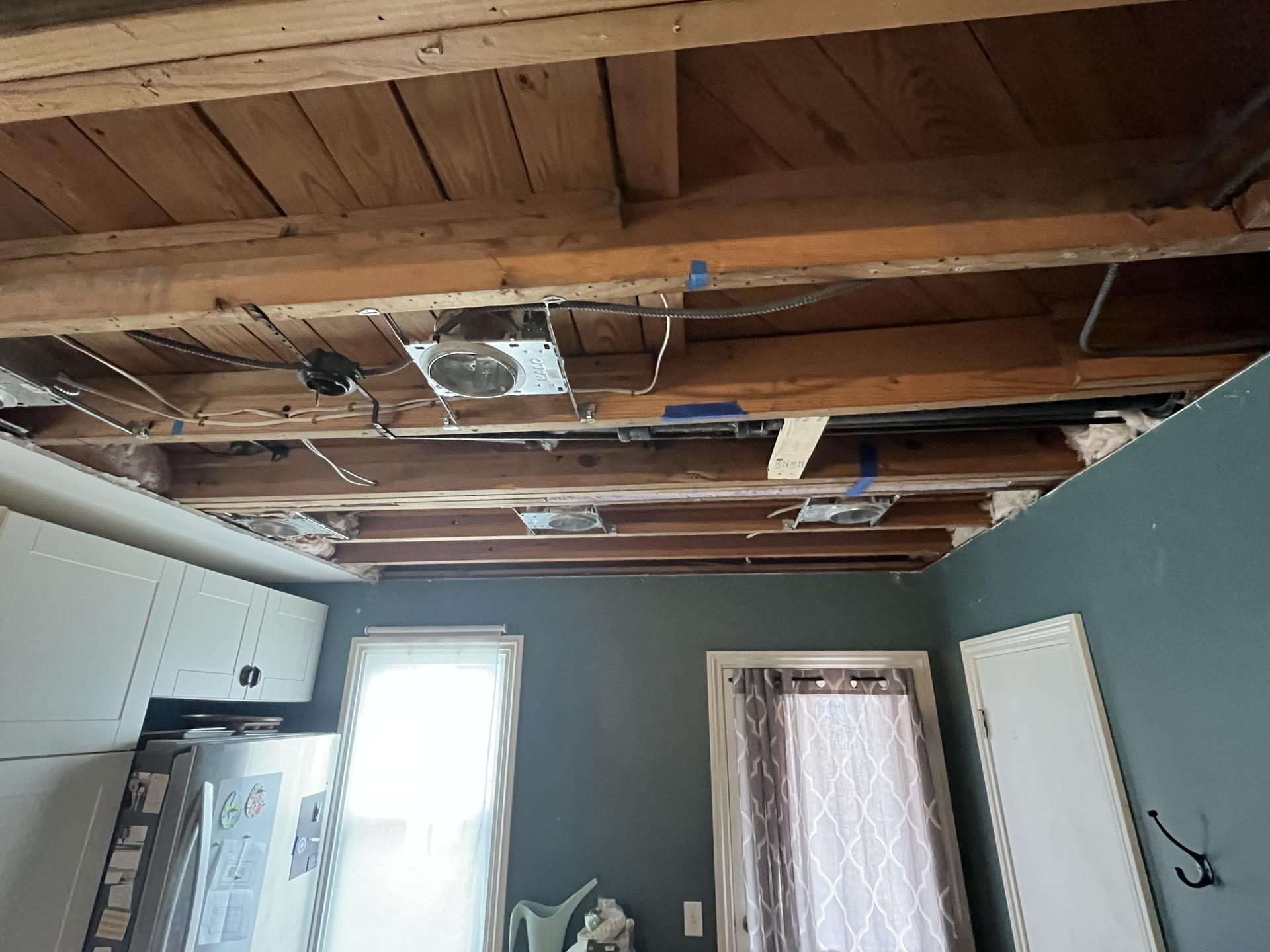 Kitchen view with a water-damaged false ceiling completely removed, showcasing exposed wooden joists, electrical conduit, and plumbing