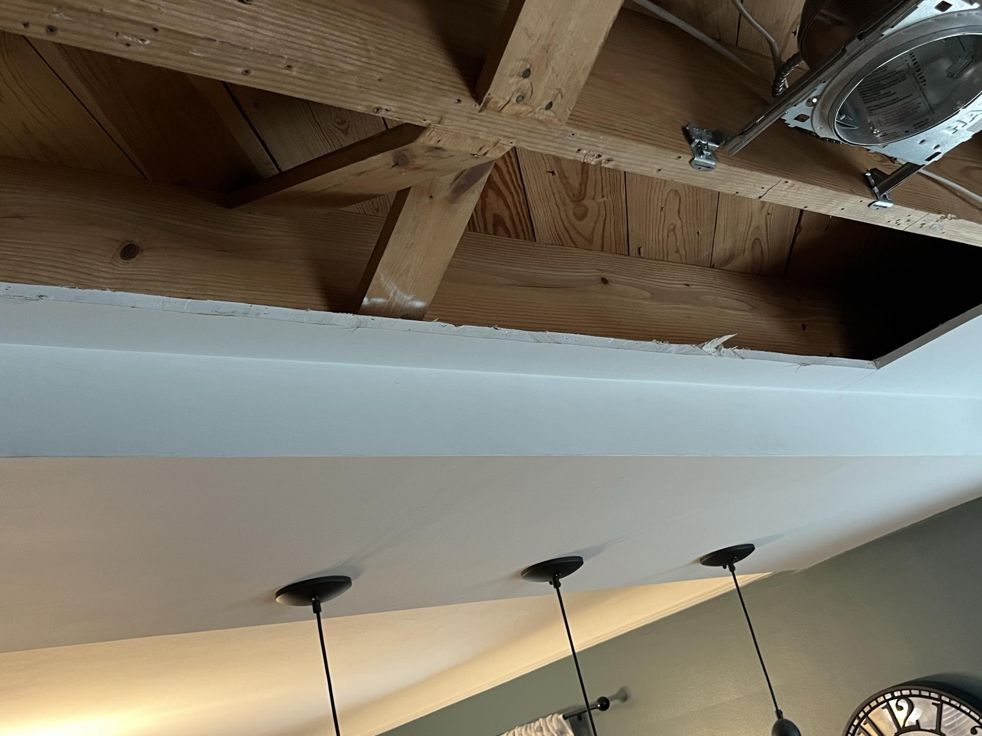 Water damage restoration showing a section of false ceiling removed, exposing wooden joists and a recessed light fixture