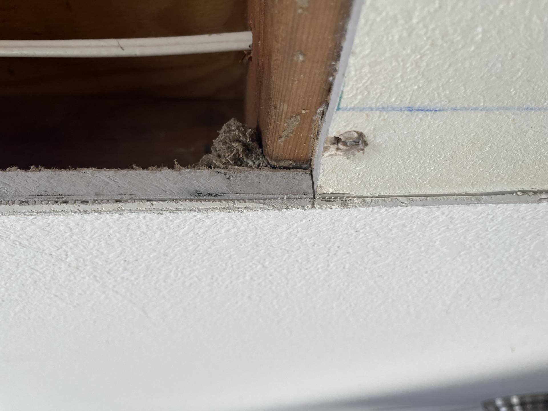 Close-up of a ceiling during sewage damage restoration, showing exposed joists, insulation, rough-in electrical, and partial drywall installation.