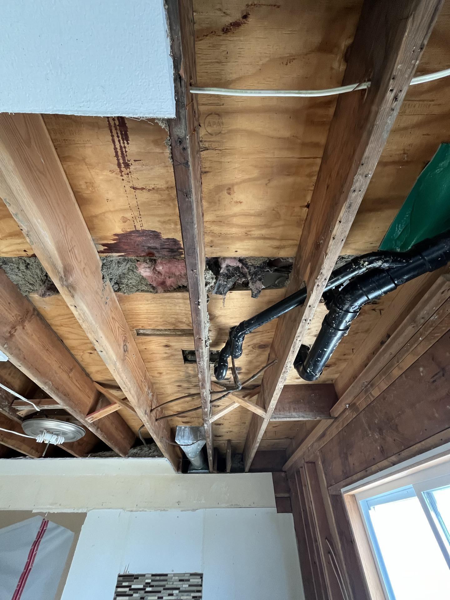Upward view of exposed ceiling joists, plumbing pipes, and rough-in electrical wiring, highlighting the structural work during sewage damage restoration.