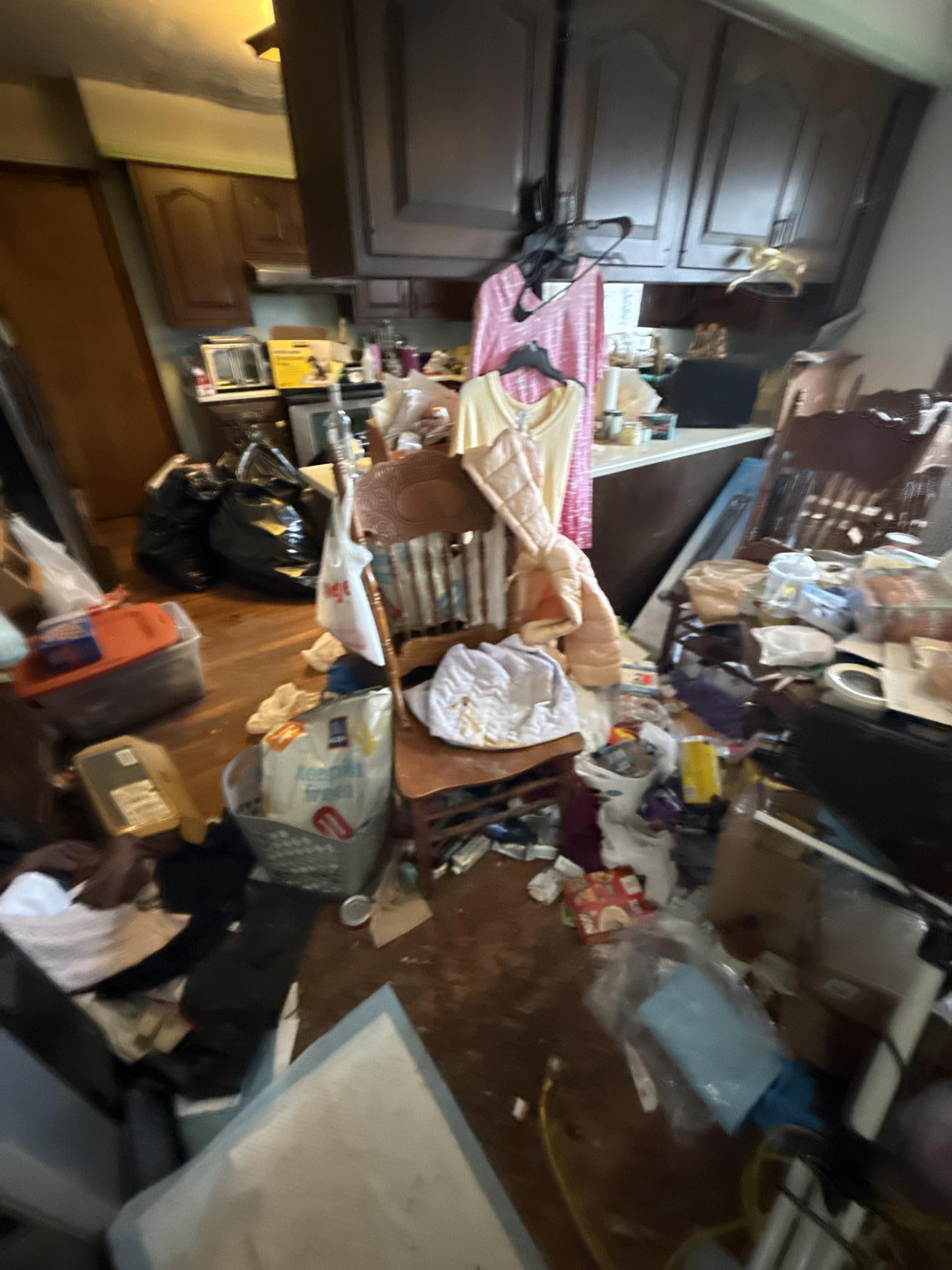 Kitchen area overwhelmed with clutter, including clothes, bags, and miscellaneous items covering countertops, chairs, and the floor before cleanup.