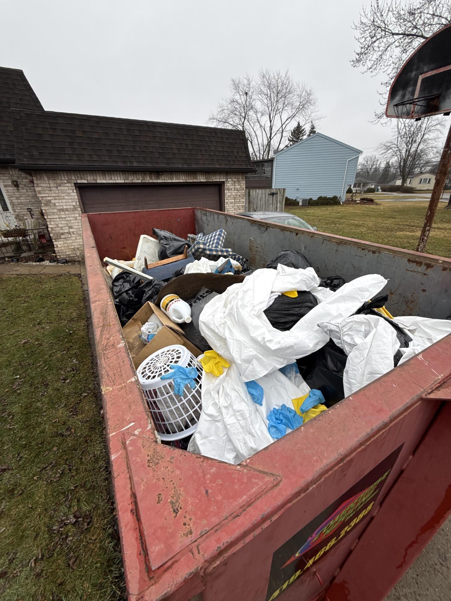 Large red dumpster overflowing with household waste, debris, and black trash bags from a hoarding cleanup service in a residential driveway.