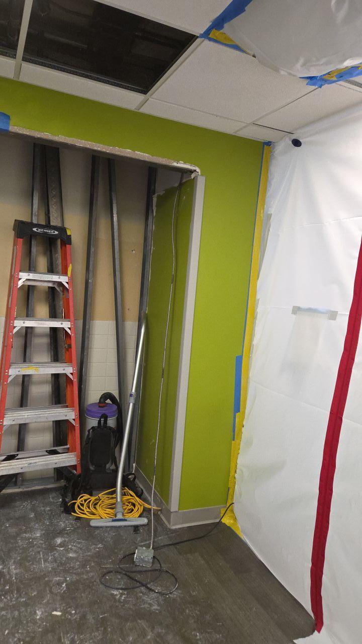 Interior view of a medical center room undergoing water damage restoration, featuring green walls, exposed ceiling, a ladder, construction debris, and a plastic containment barrier isolating the work zone.