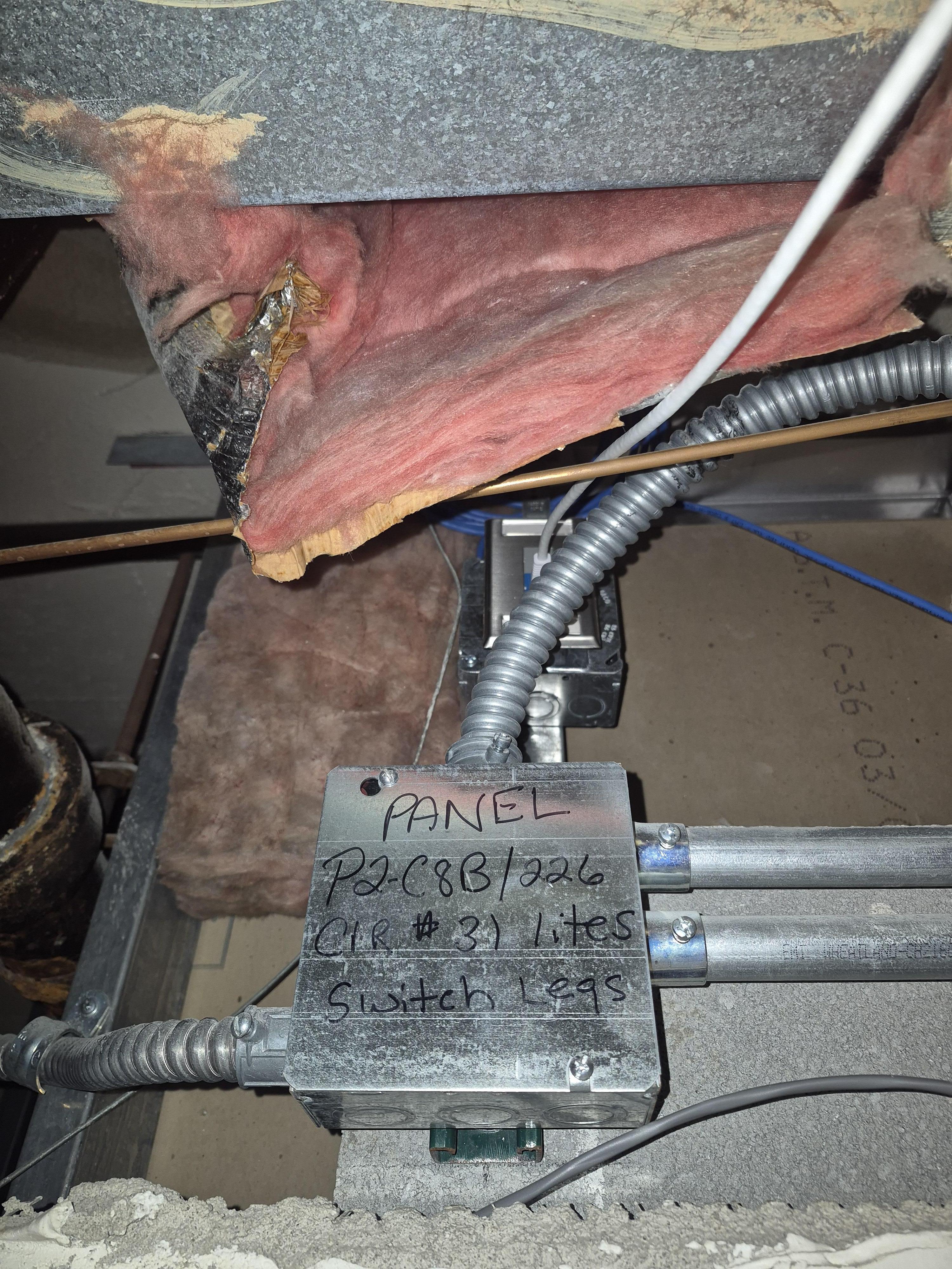 Close-up of exposed ceiling utilities during water damage repair at a medical center, showing insulation, electrical conduits, and a junction box labeled 'PANEL', indicating repair work on damaged infrastructure.