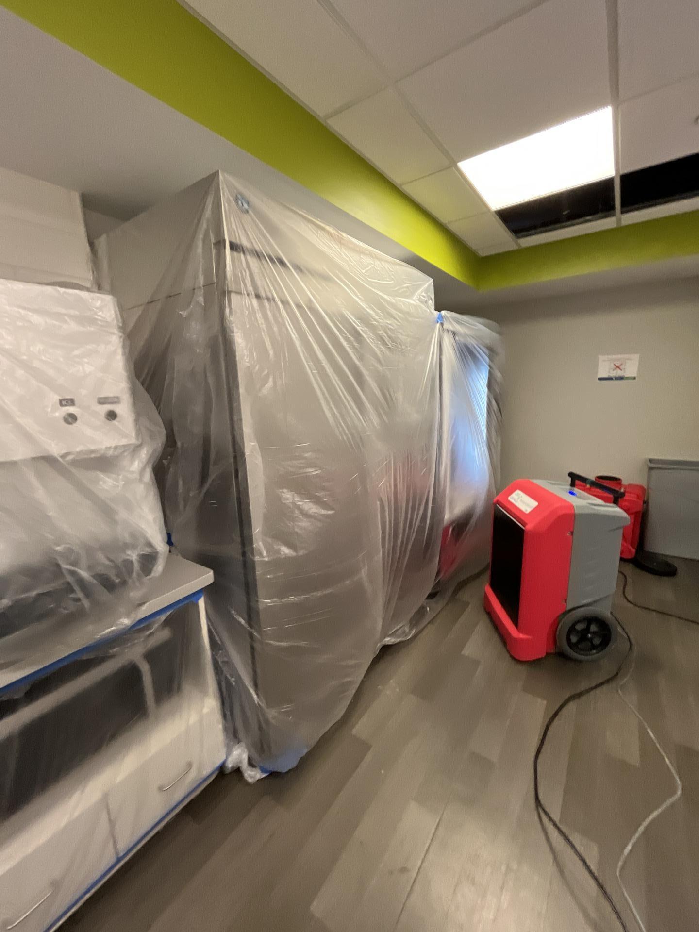 The restoration team promptly responded by removing standing water, thoroughly cleaning and sanitizing all impacted surfaces, and implementing secure containment measures to protect sensitive medical equipment. Damaged ceiling sections were addressed, and industrial drying equipment was deployed to effectively eliminate excess moisture. The area was fully restored to a clean, safe, and operational condition with minimal disruption to the medical center's activities.