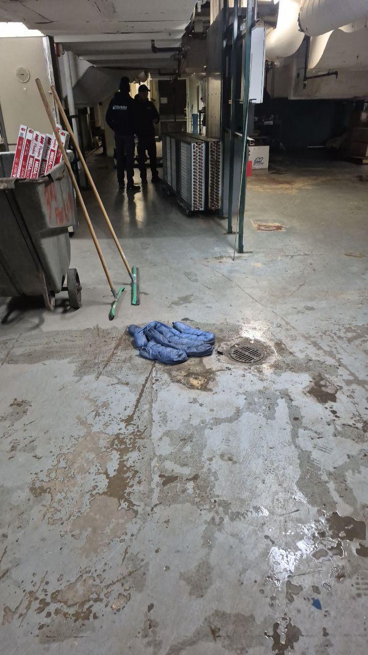 Cousino Restoration team assessing initial water damage in a medical center's utility area, showing standing water on a concrete floor, brooms, and workers in the background preparing for water removal.
