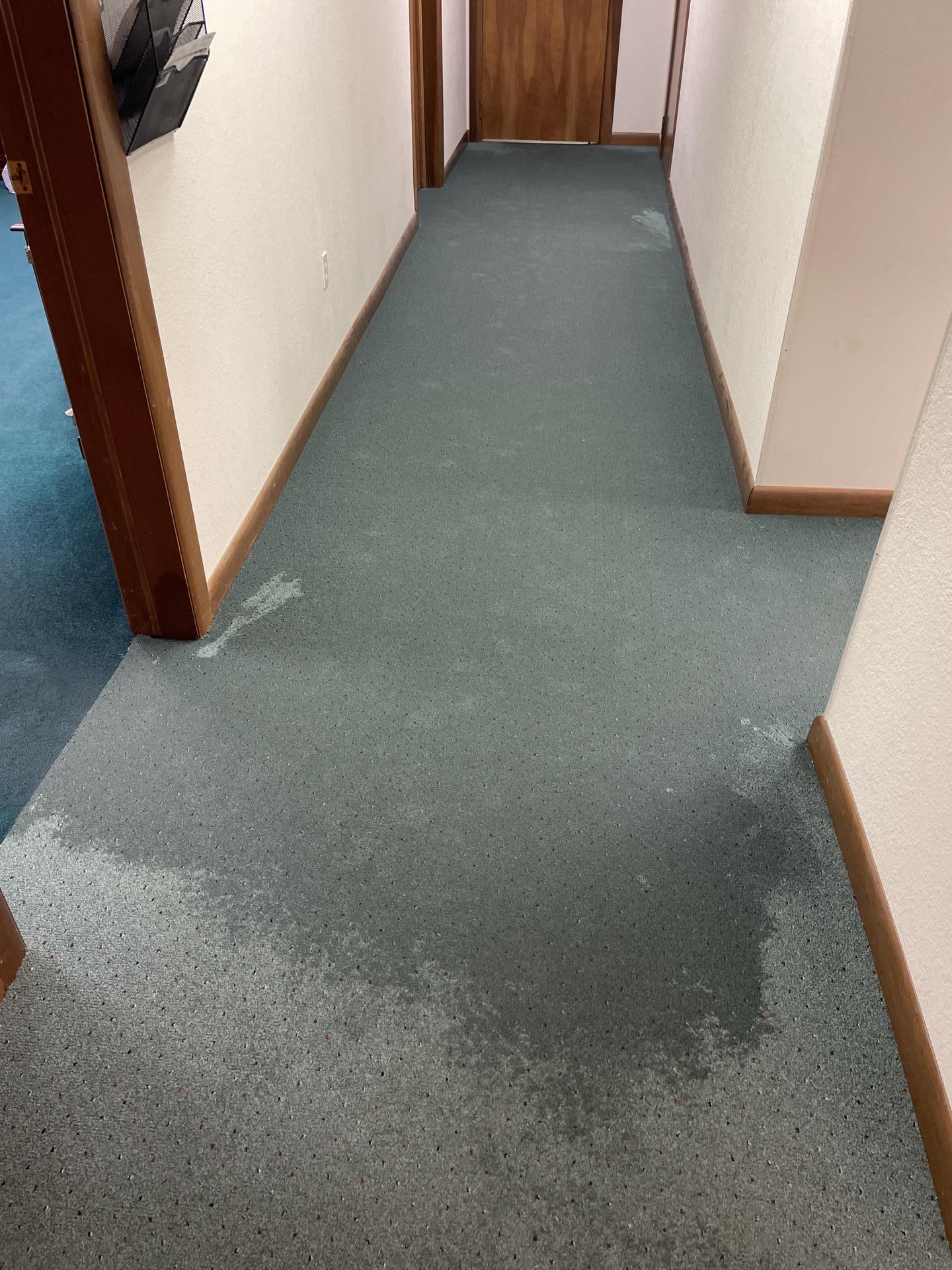 The customer experienced water intrusion affecting carpeted areas in a commercial property, evident from visible wet spots and requiring immediate professional water damage restoration.